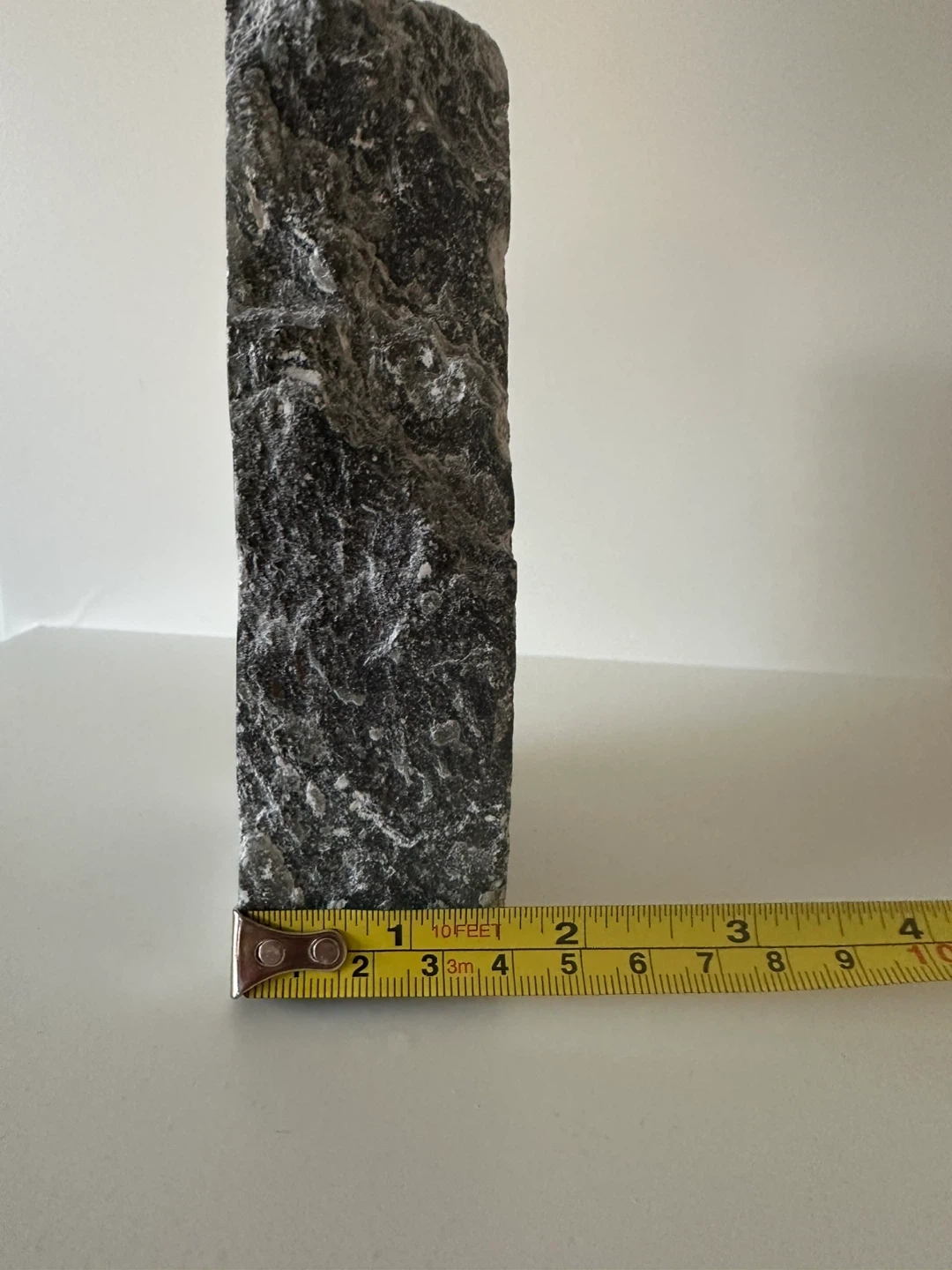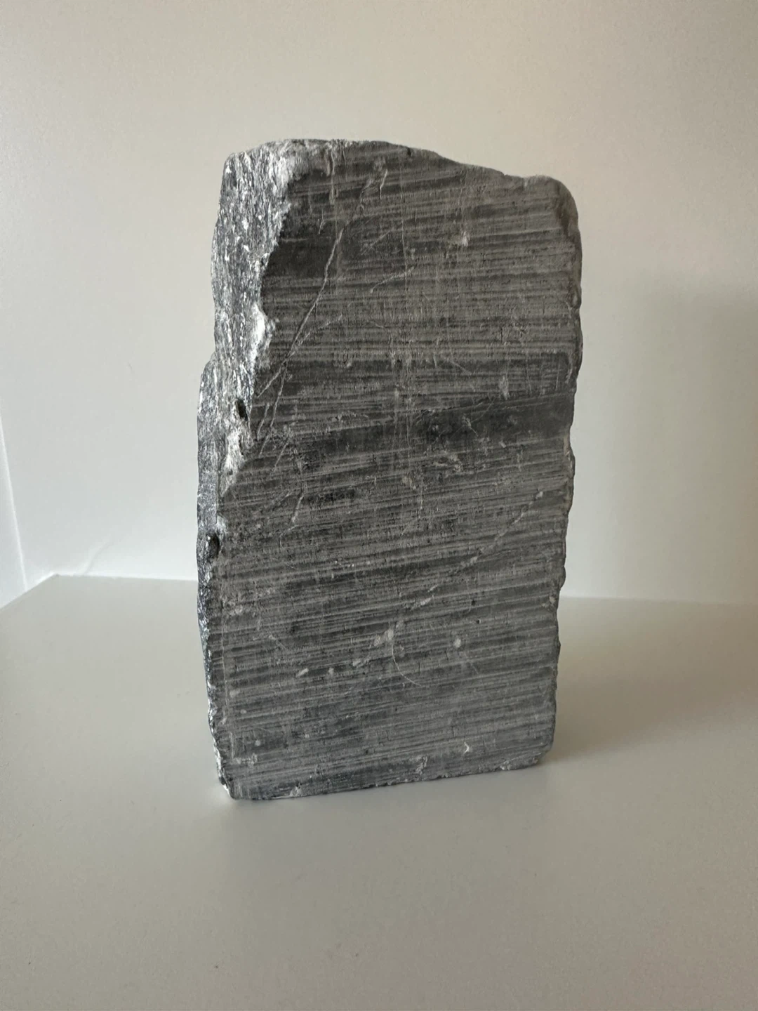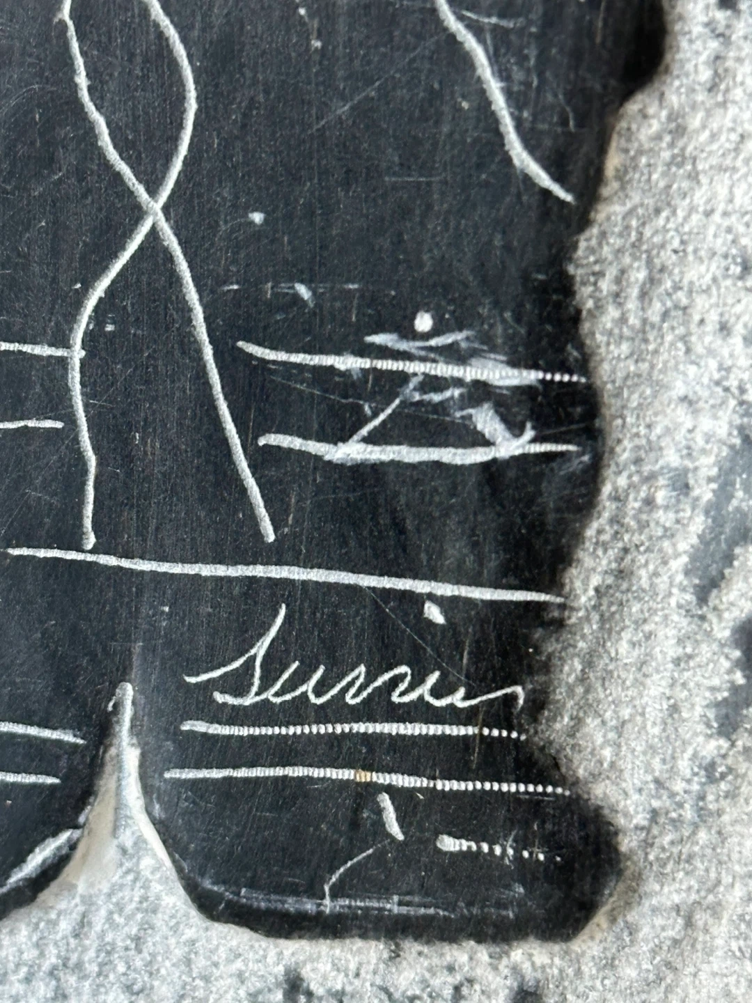This is a stone carving featuring a mother holding a child. The carving is etched into a natural stone slab with rough edges. The artist's signature, is visible on the front.