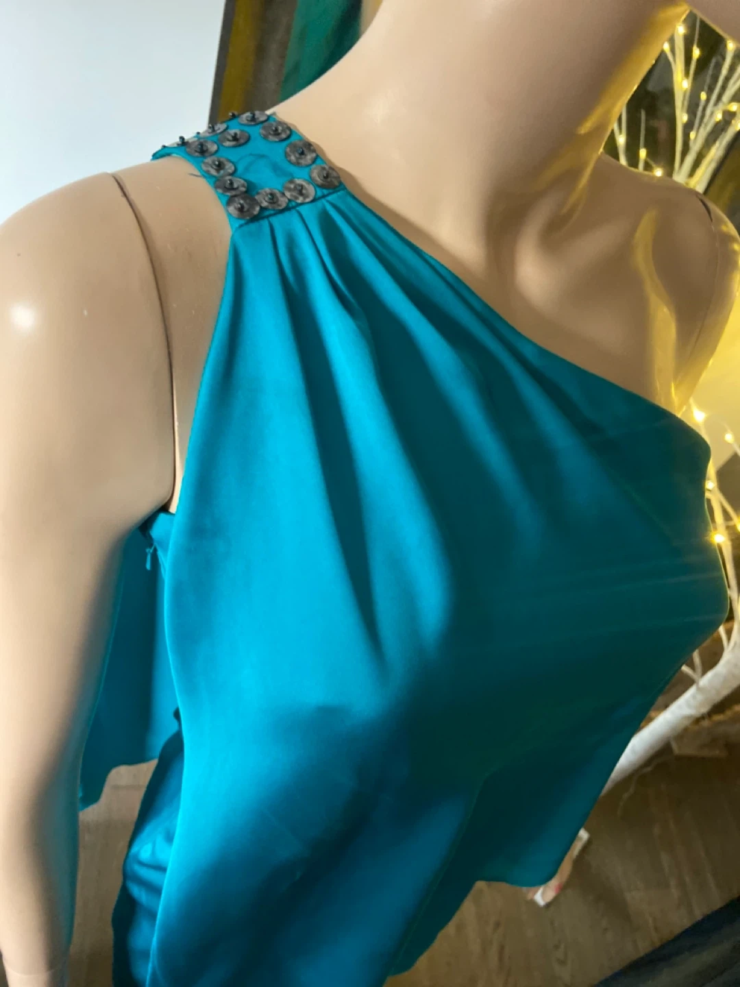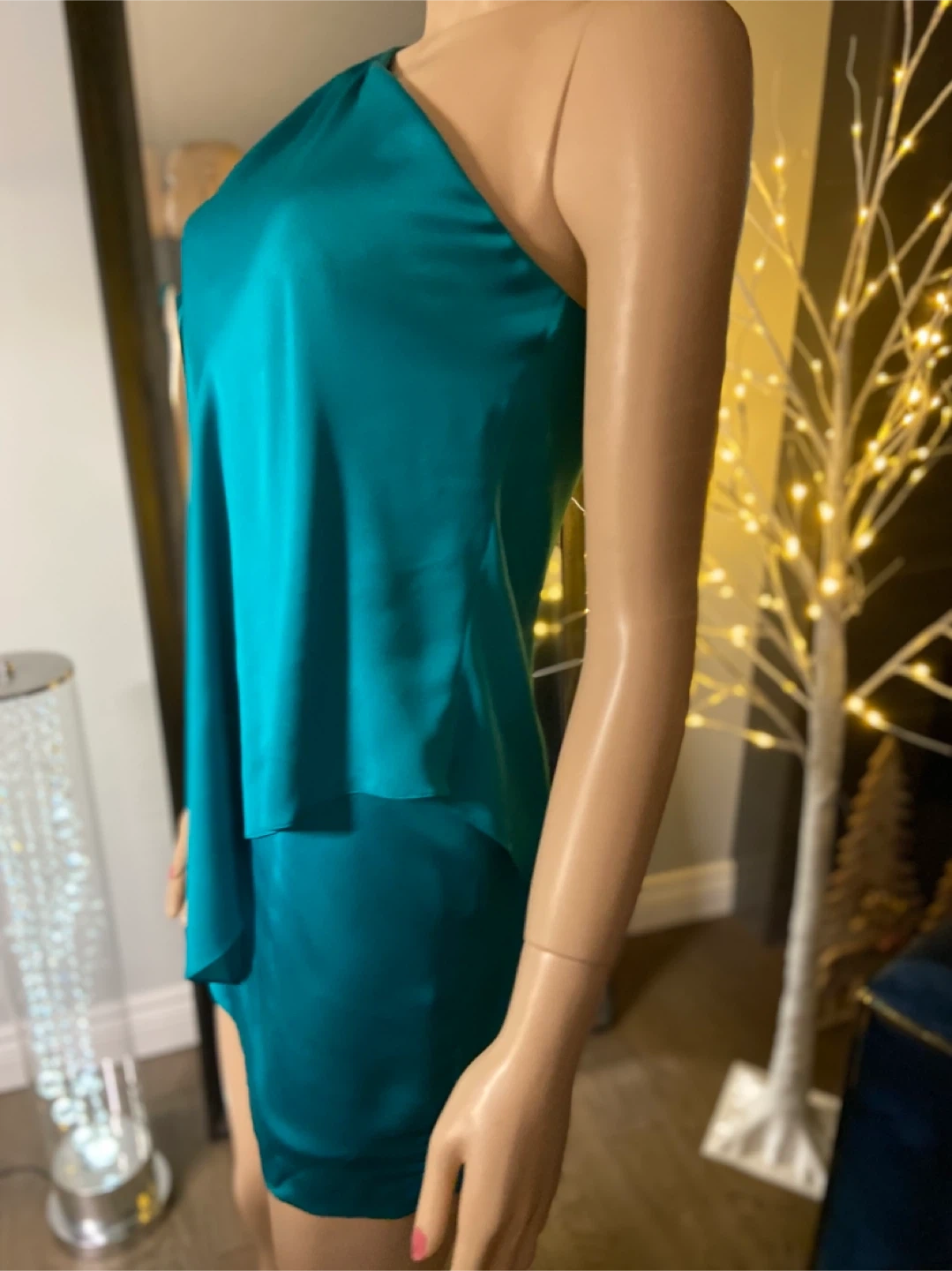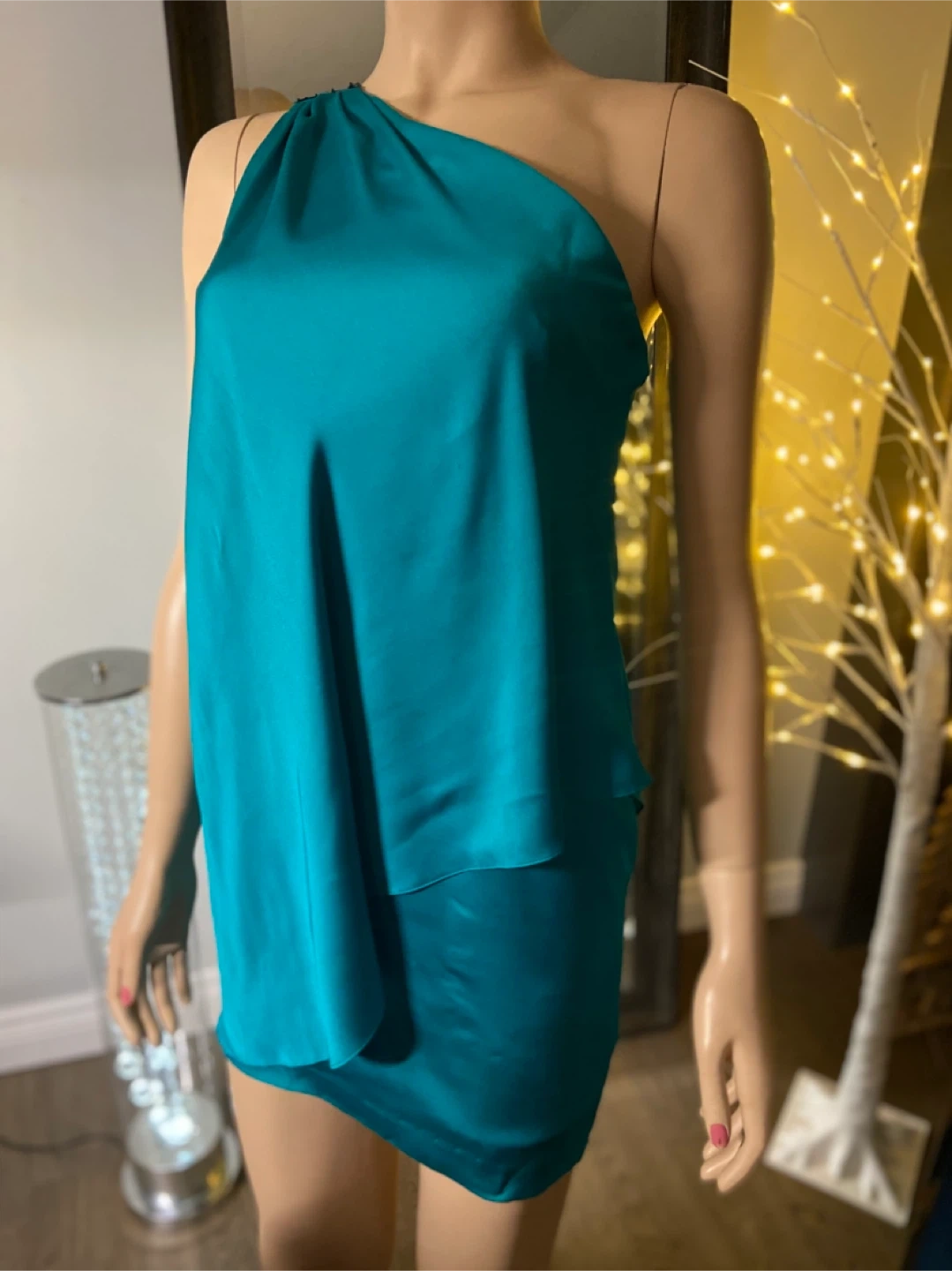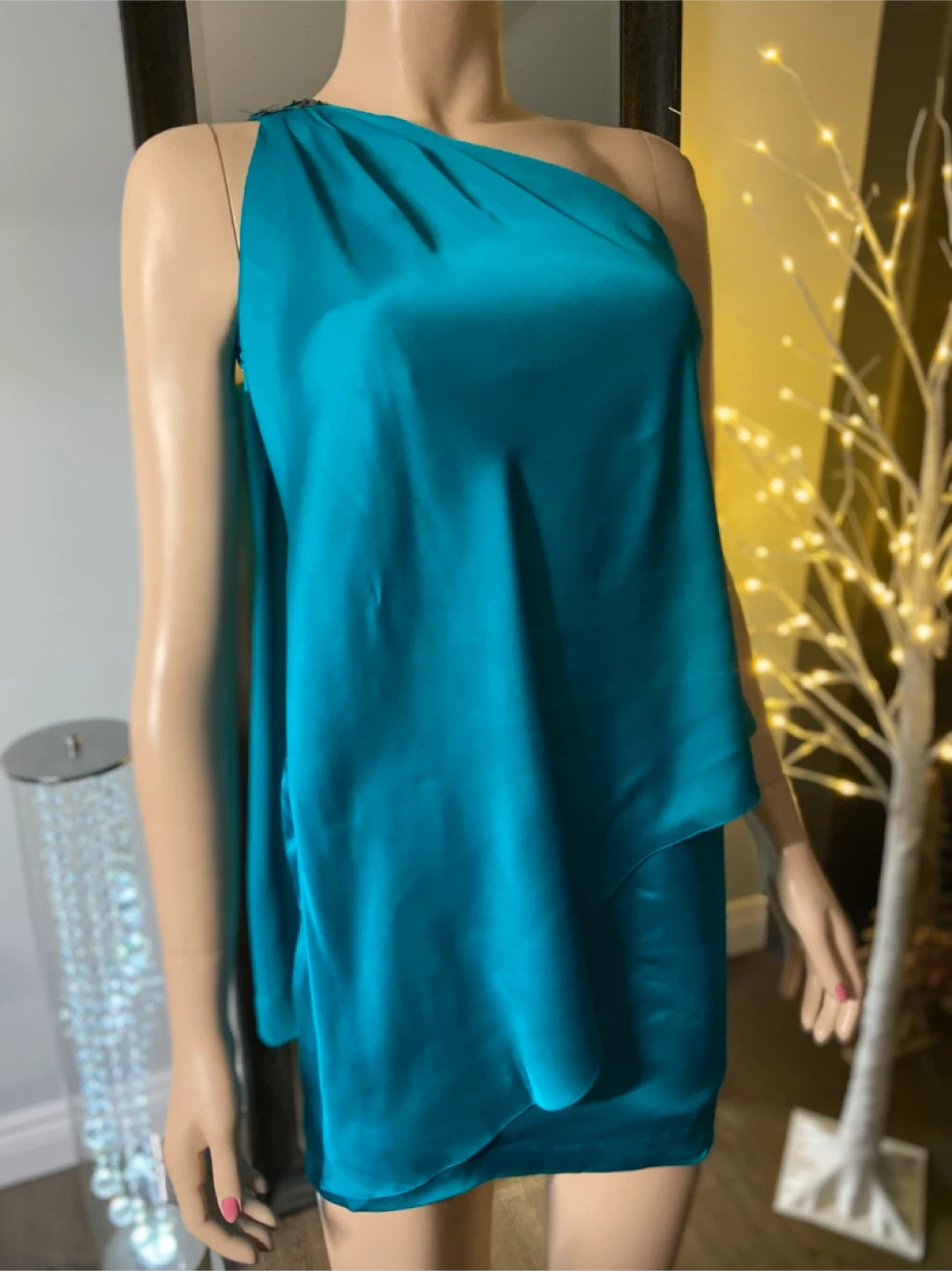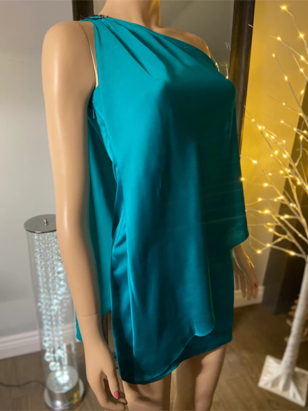 A striking teal cocktail dress with a chic one-shoulder design. It's made from a flowing, silky fabric that drapes beautifully