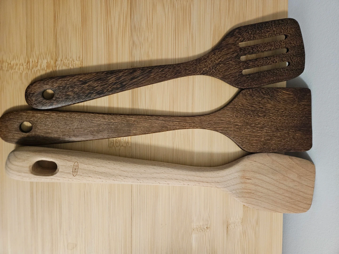 Set of three wooden cooking utensils. Includes a slotted spatula, a solid spatula, and a spoon. The OXO utensil is made of light wood, and the other two are dark wood. All have hanging holes.