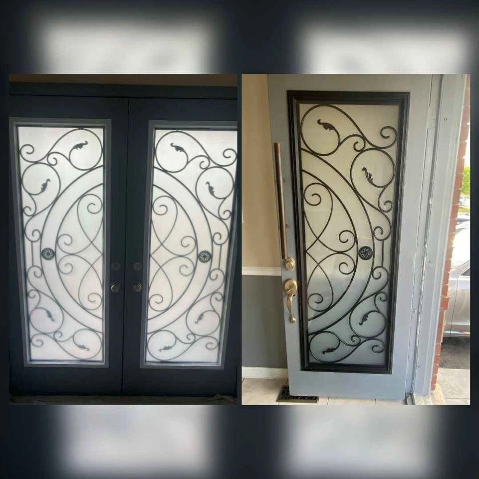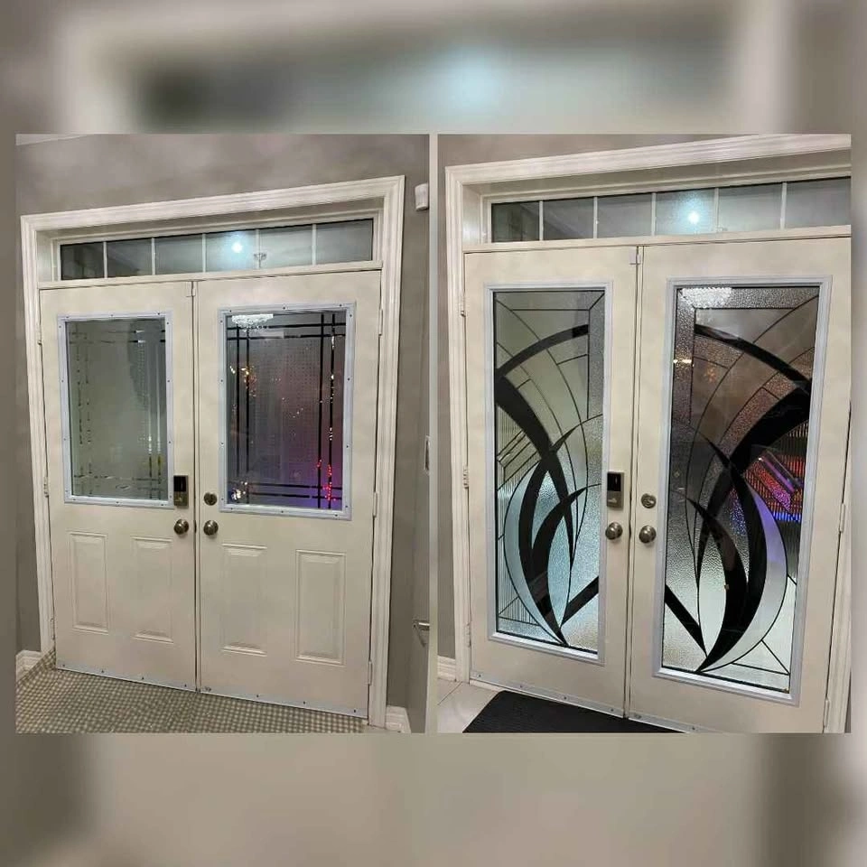 We have glass door inserts available in over 100 designs. Options include single door inserts, double door inserts, half inserts, and 3/4 inserts. Best price guaranteed. Includes installation and warranty. Message for more designs and details.
