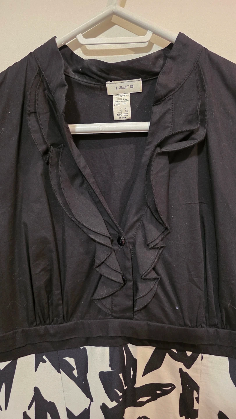 This sleeveless dress features a black bodice with a ruffled neckline and a bold floral print skirt. It's made with a comfortable cotton blend. A stylish choice for warmer days!