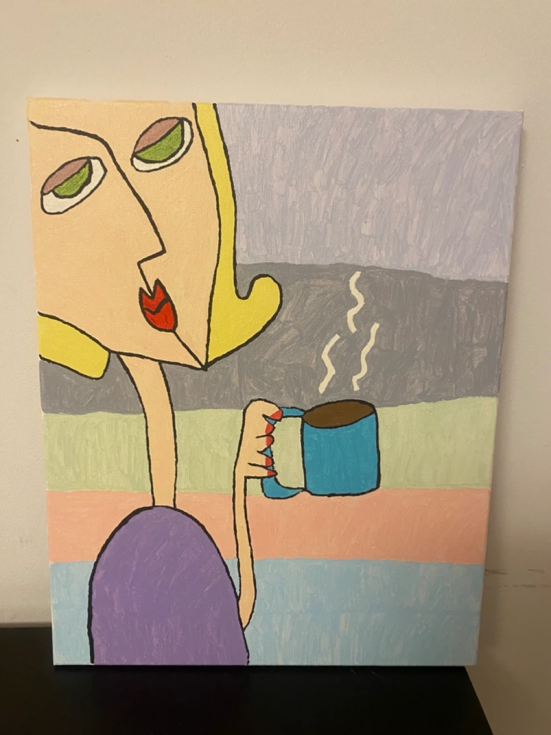 Acrylic painting on canvas featuring a stylized woman holding a steaming coffee mug. The background has horizontal stripes of pastel colours and grey sky. This piece adds a touch of modern art to any space.
