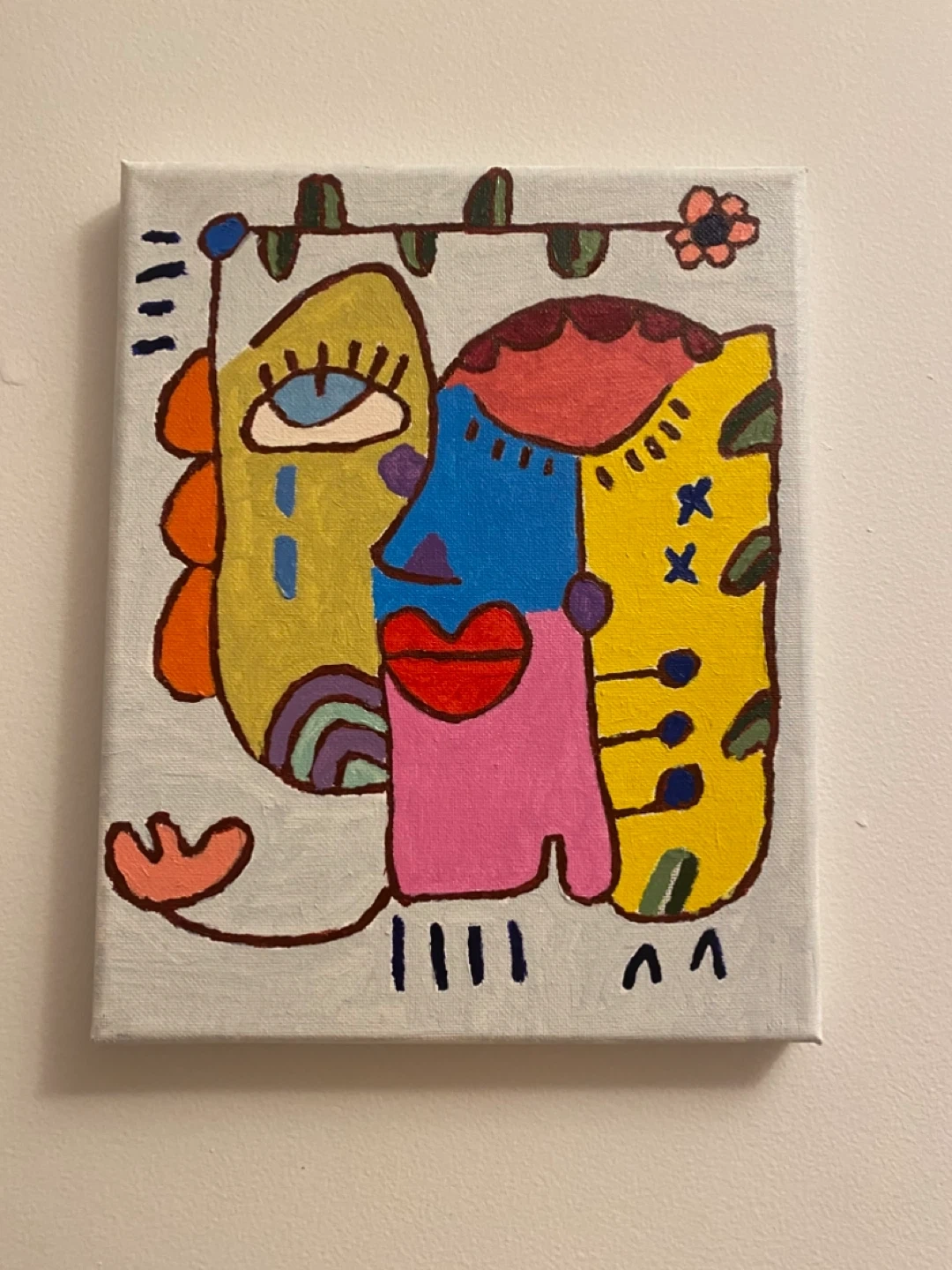 A colourful canvas painting featuring a unique abstract face design. It's an eye-catching piece with bold colours like yellow, blue, and pink. This artwork would add a pop of personality to any room!