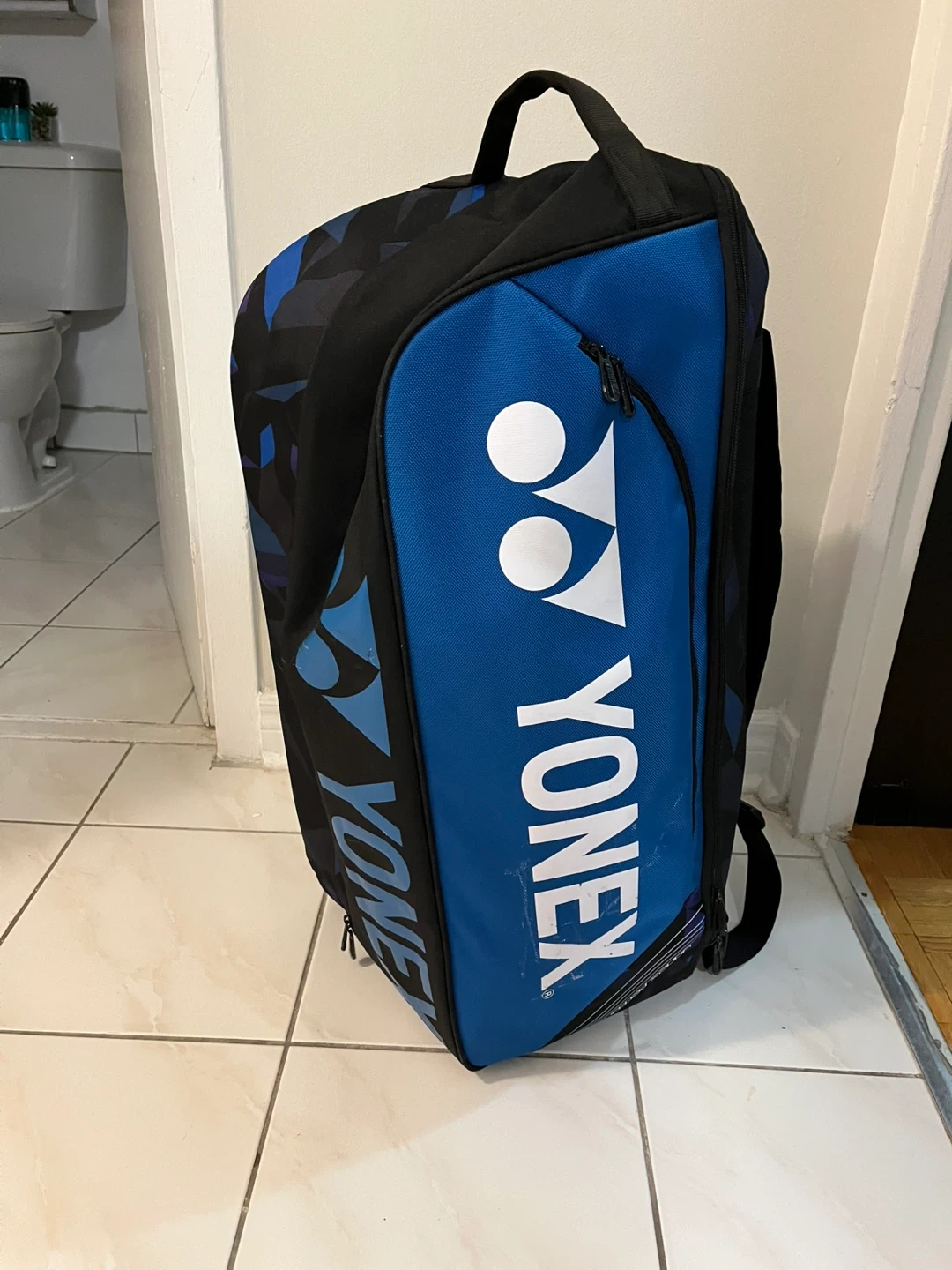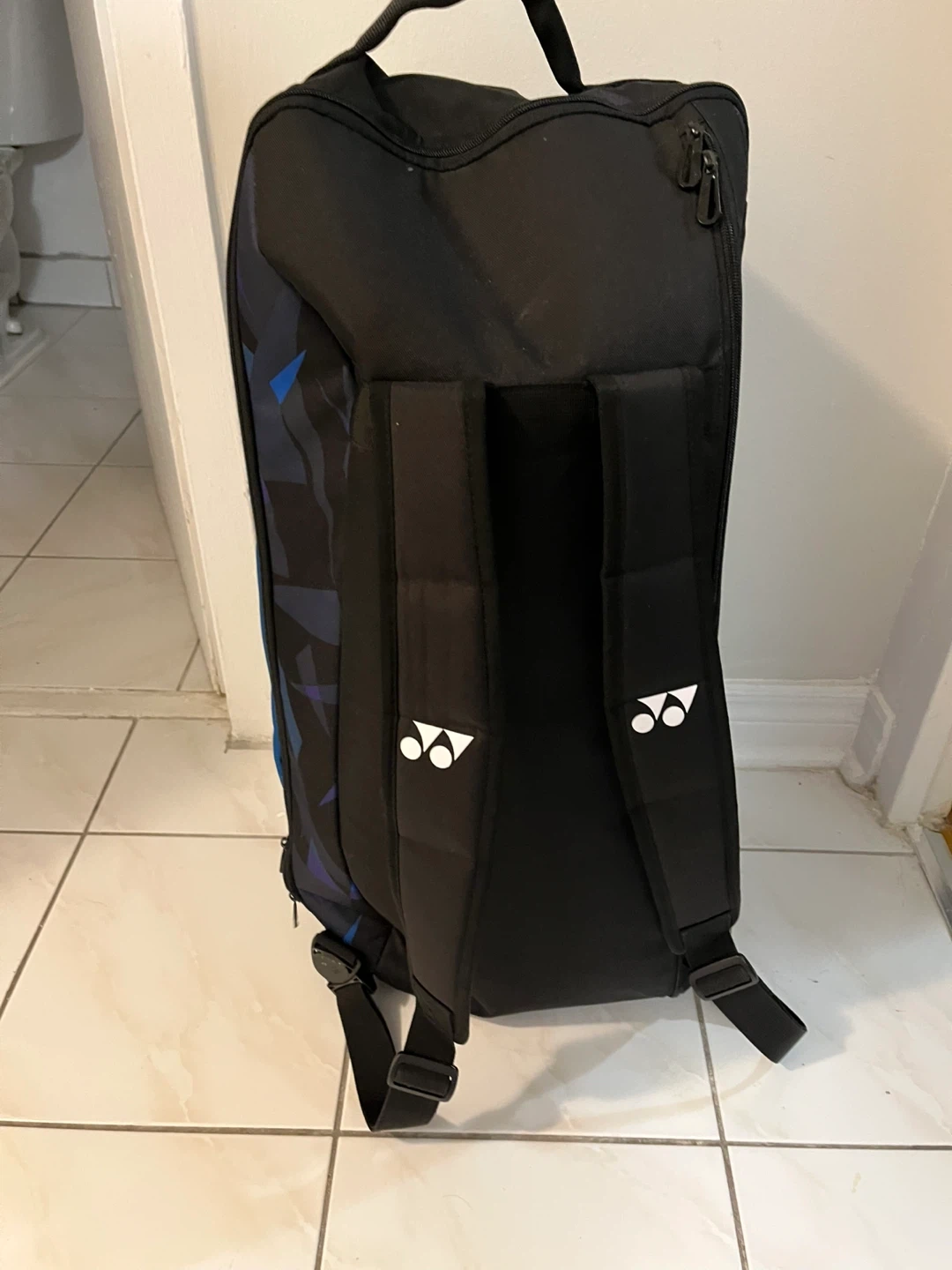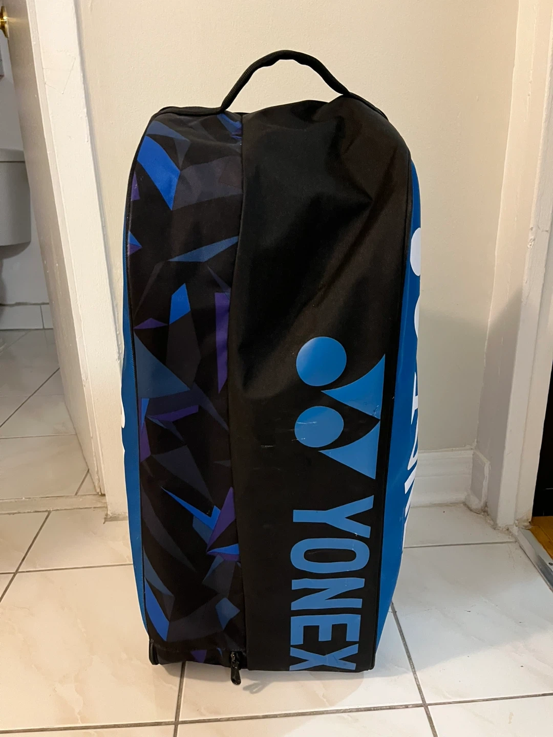 This is a Yonex badminton bag. It has a bright lime green interior with multiple compartments. The exterior is black and blue with geometric patterns and the Yonex logo. It features backpack straps for easy carrying.