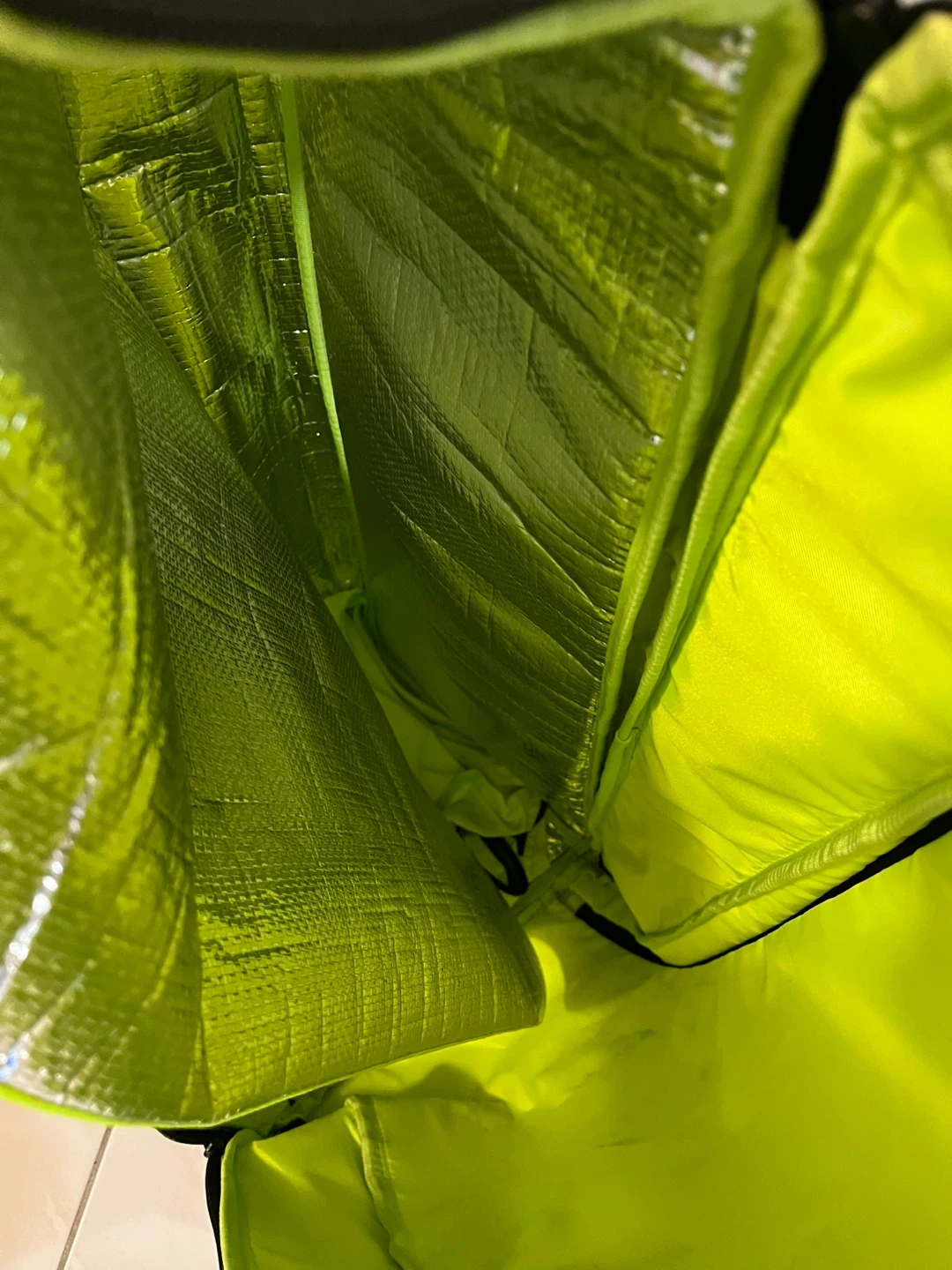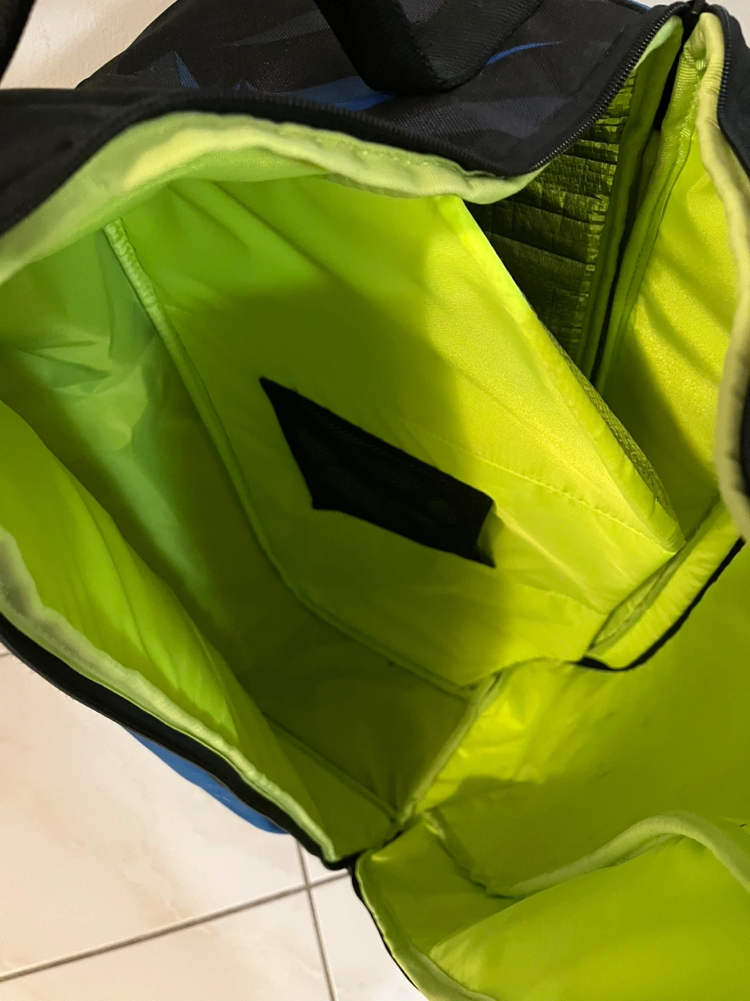 This is a Yonex badminton bag. It has a bright lime green interior with multiple compartments. The exterior is black and blue with geometric patterns and the Yonex logo. It features backpack straps for easy carrying.