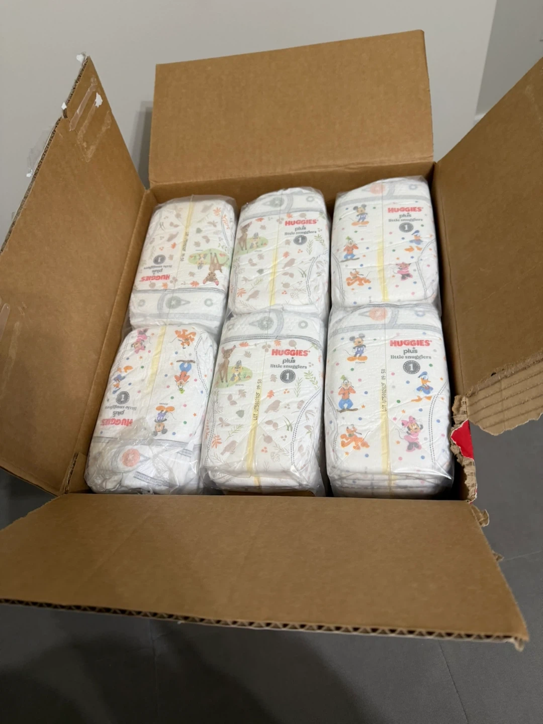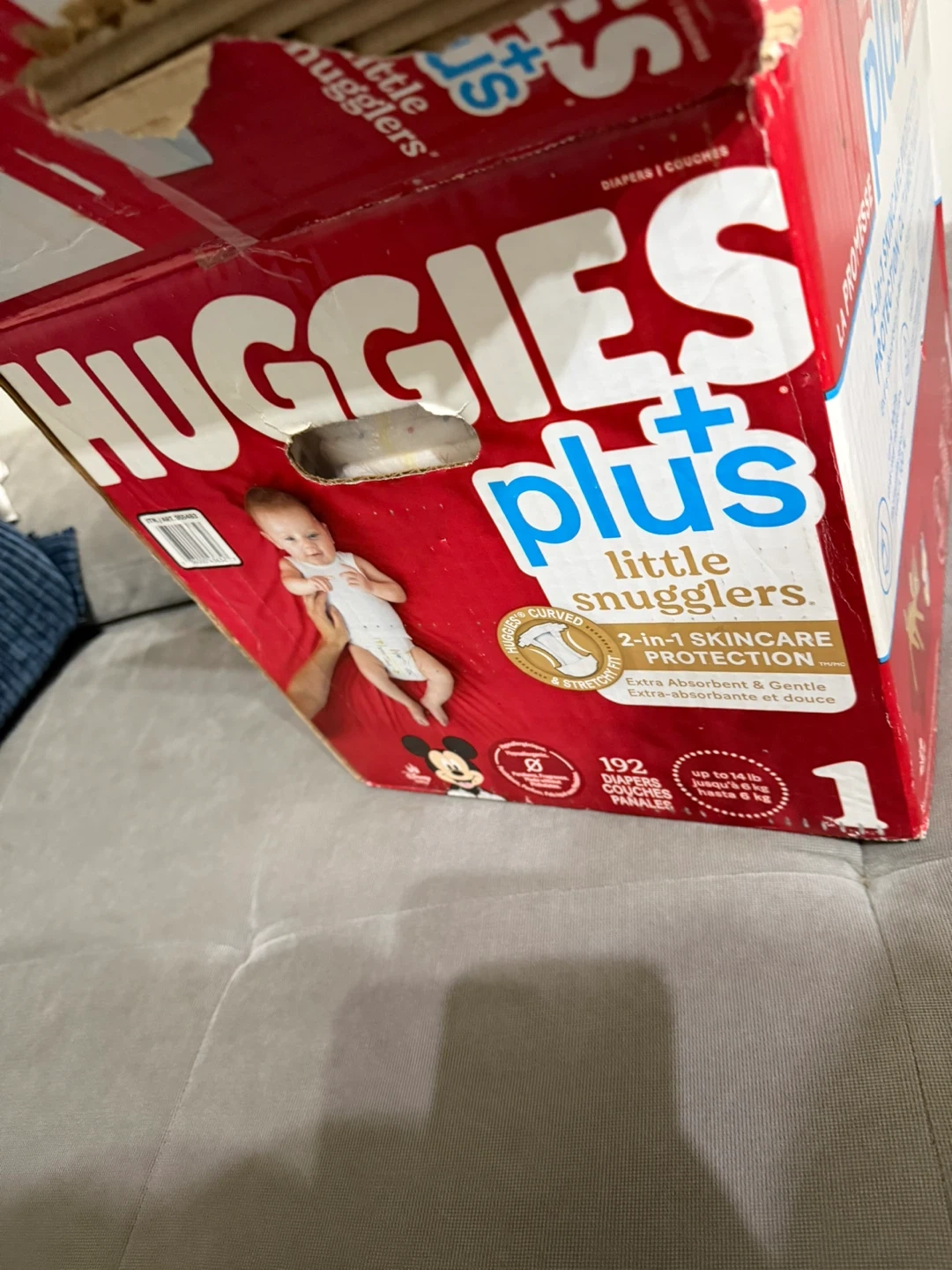 Brand new Huggies Plus Little Snugglers diapers. This box contains 192 diapers in size 1. They're designed for babies up to 14 lbs. Extra absorbent and gentle for skincare protection!
