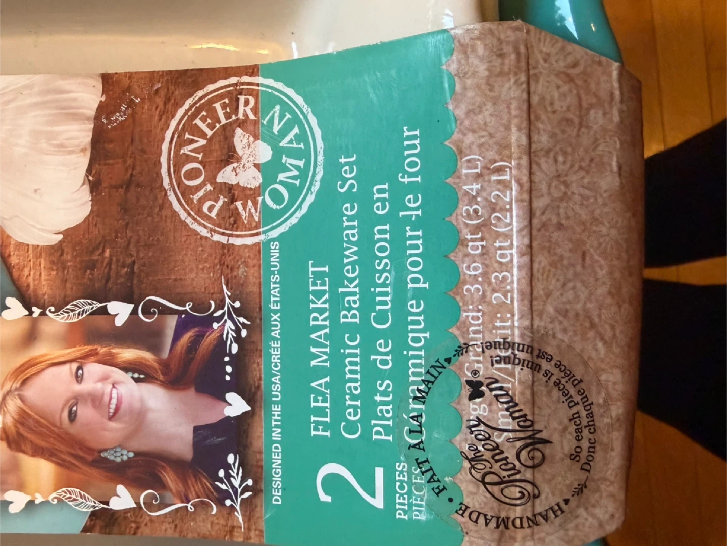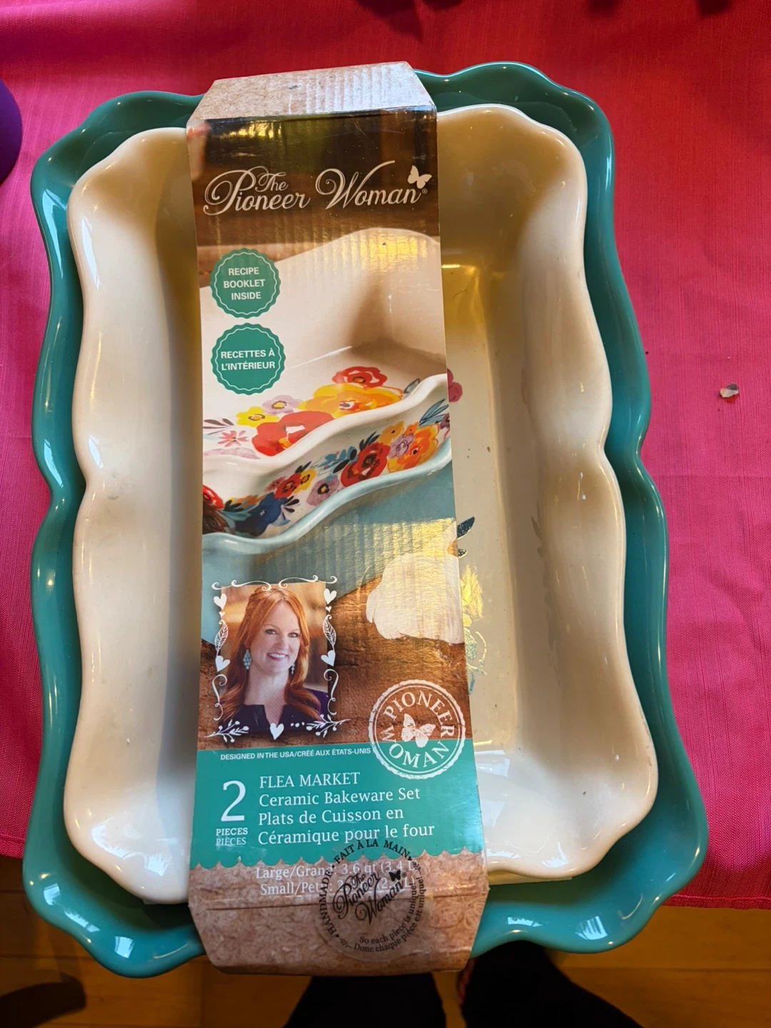 This is a 2-piece ceramic bakeware set from The Pioneer Woman's Flea Market collection. It includes one large dish measuring 3.6 qt and one small dish measuring 2.3 qt. Both pieces are dishwasher, microwave, and oven safe up to 450°F.