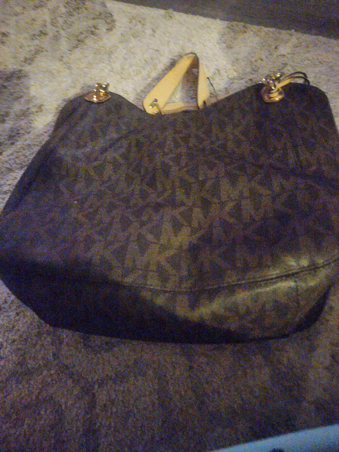 This Michael Kors shoulder bag features the brand's signature MK monogram pattern. It has light tan leather straps and gold-tone hardware. The bag's material appears to be a coated canvas with leather trim.