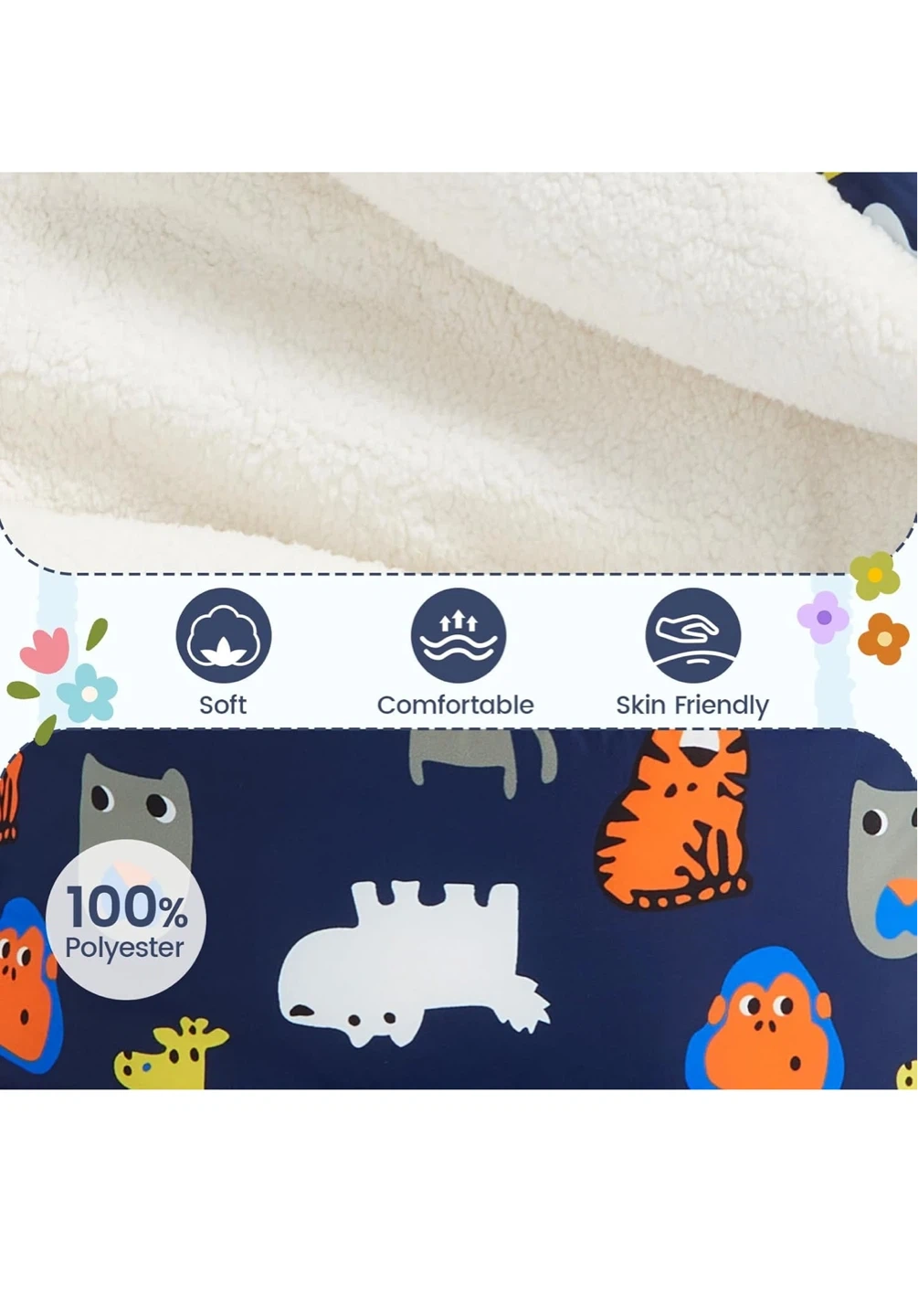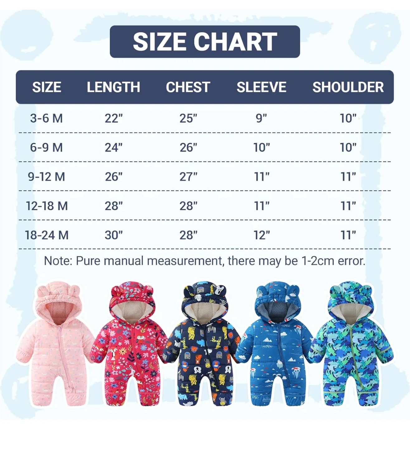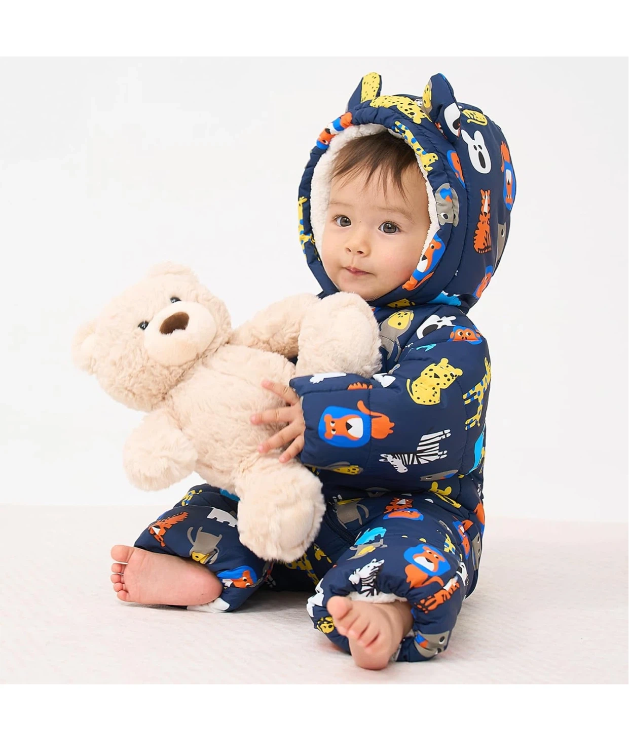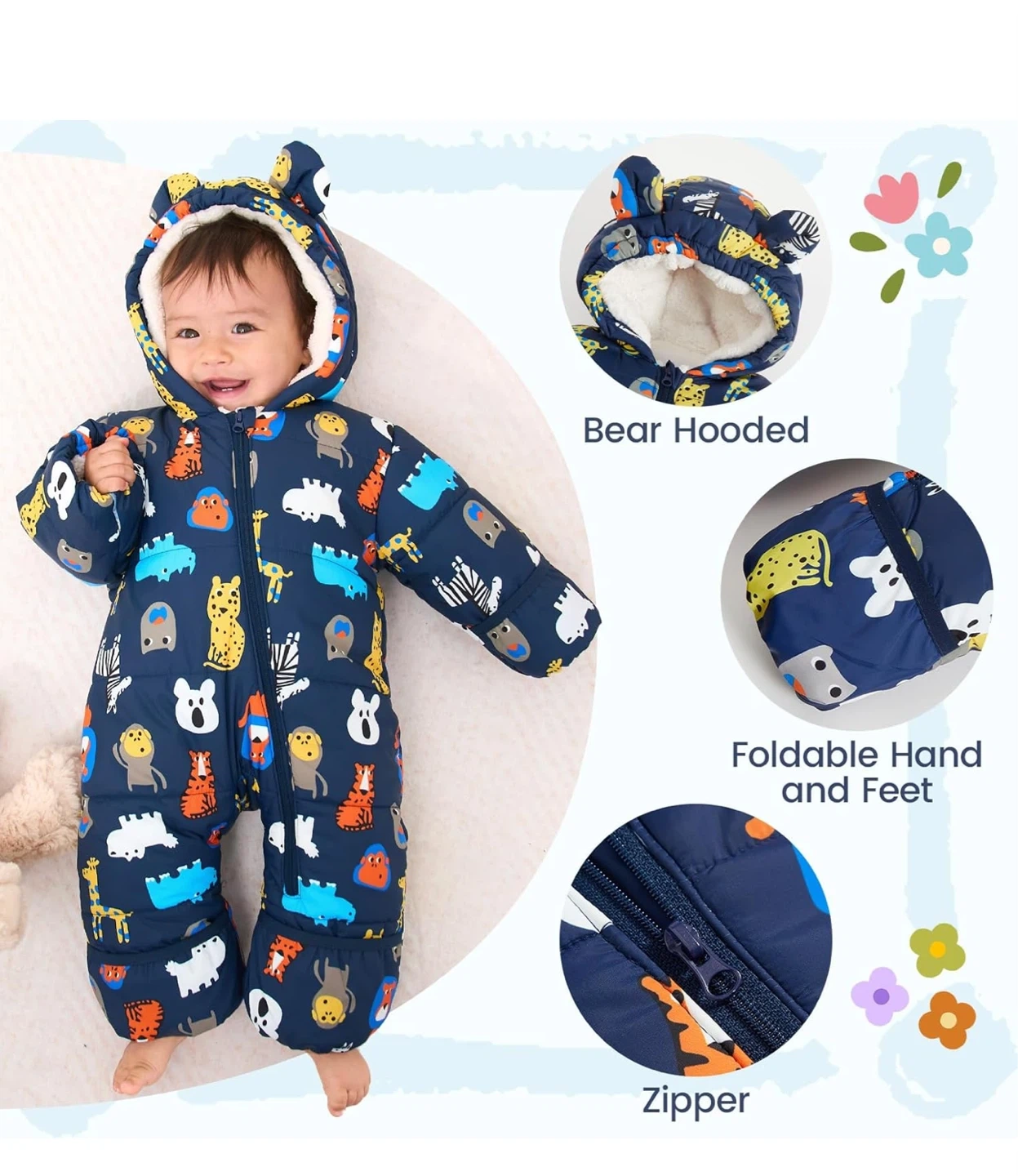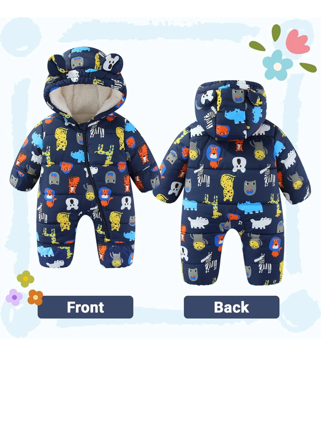 Adorable navy blue snowsuit featuring a fun zoo animal print. It has a cozy fleece lining and a bear-eared hood to keep your little one warm. Foldable hand and feet covers for extra protection. This polyester snowsuit is soft and comfortable!