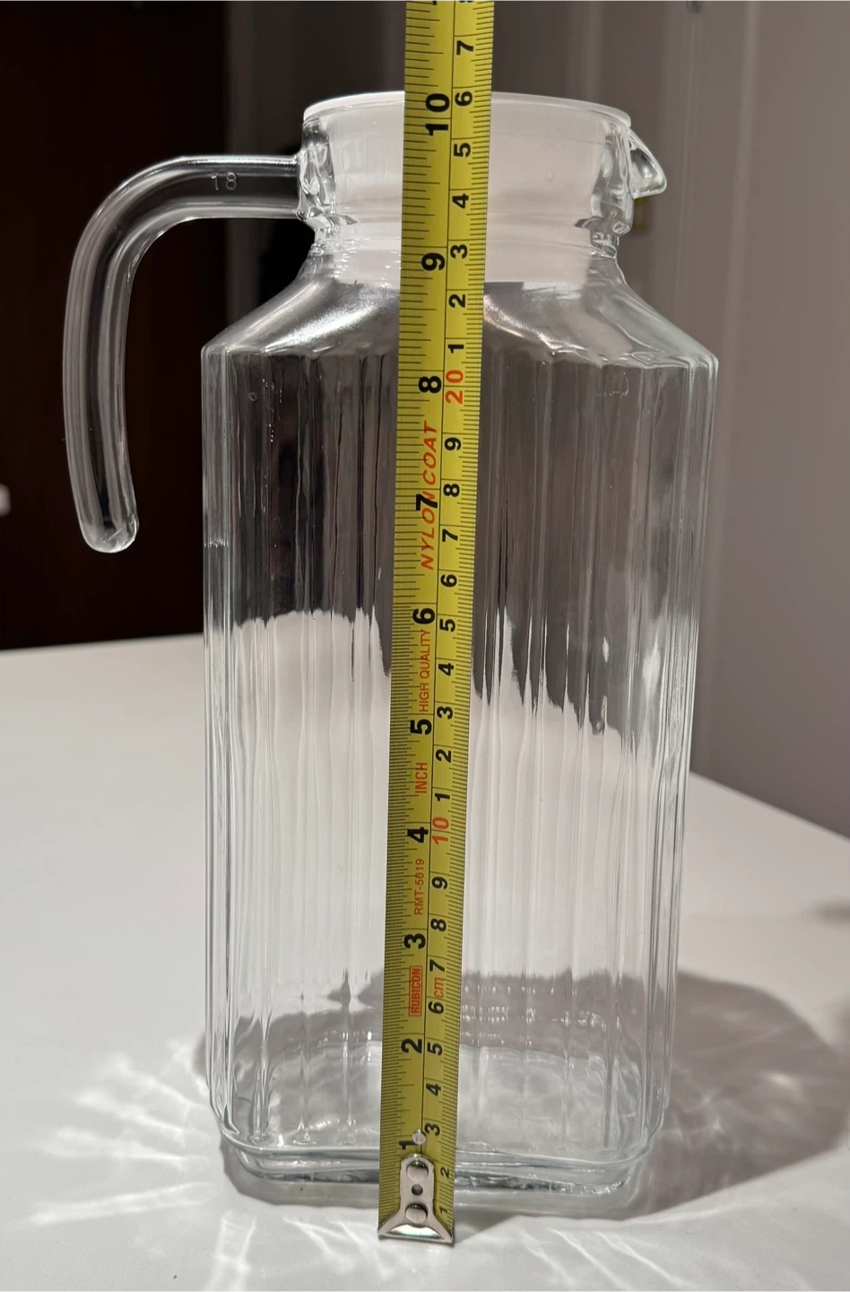 This is a clear glass pitcher with a white lid. It's approximately 9.5 inches tall and 5.5 inches wide. The pitcher is made of glass material. It's great for serving water or other beverages!