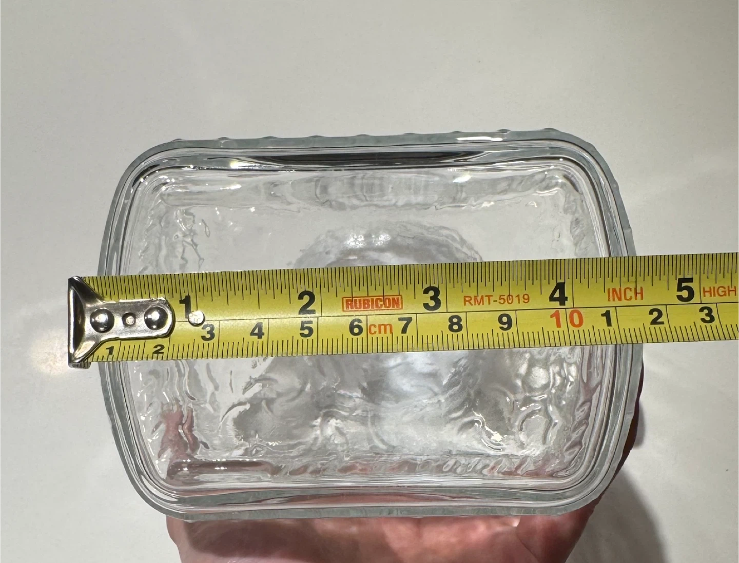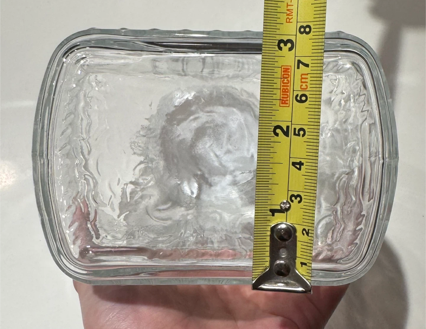 This is a clear glass pitcher with a white lid. It's approximately 9.5 inches tall and 5.5 inches wide. The pitcher is made of glass material. It's great for serving water or other beverages!