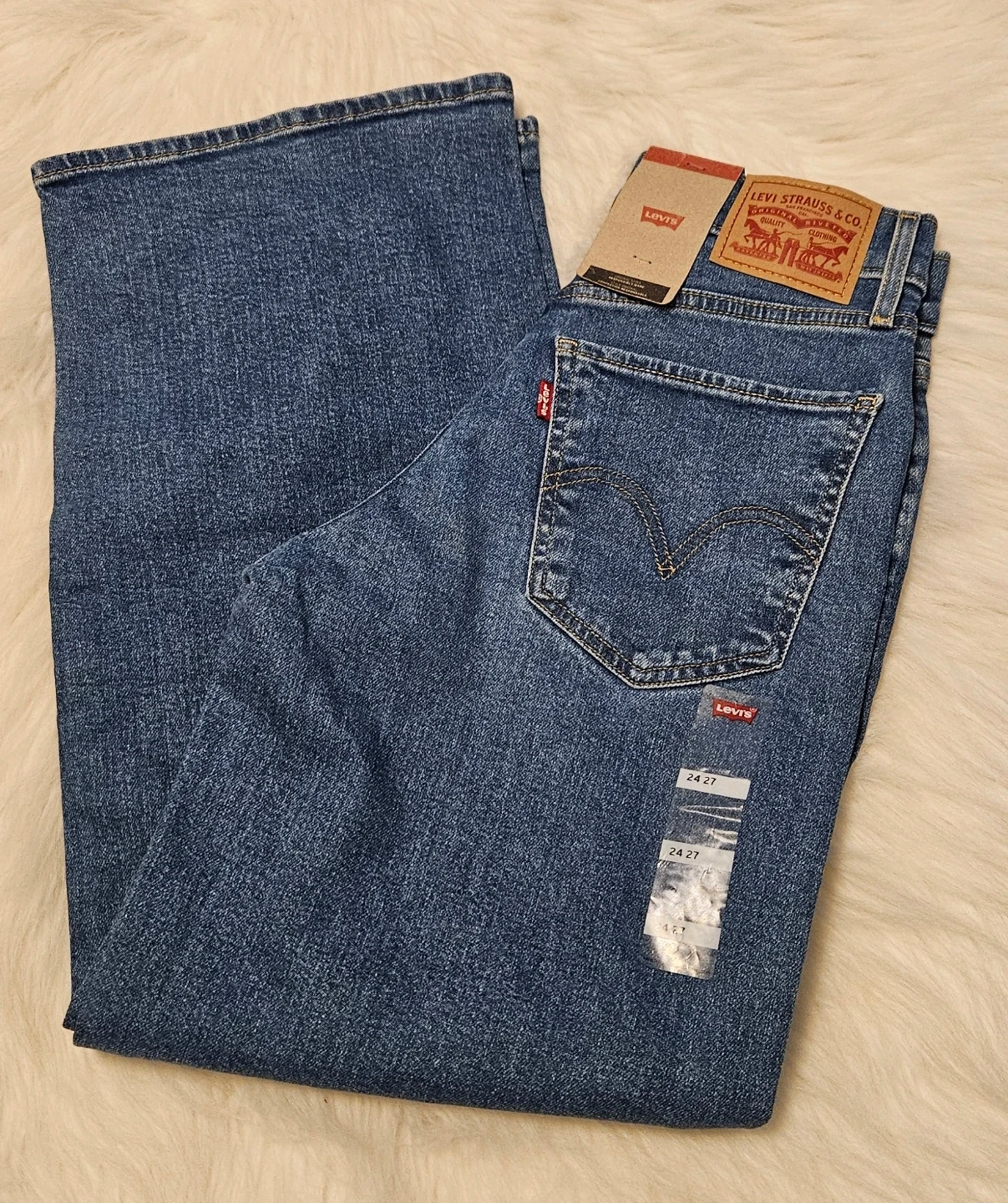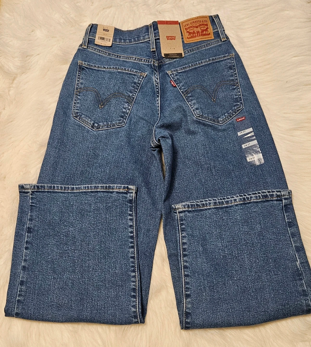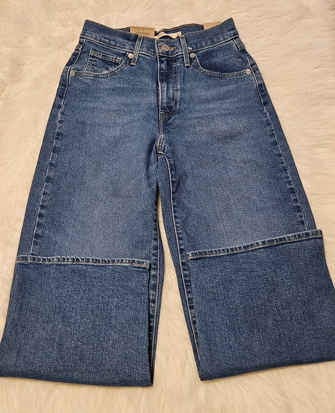 These are Levi's women's jeans in a classic blue denim wash. They have a size of 24 waist and 27 inseam. The jeans are made from durable denim material. High-Rise Wide Leg