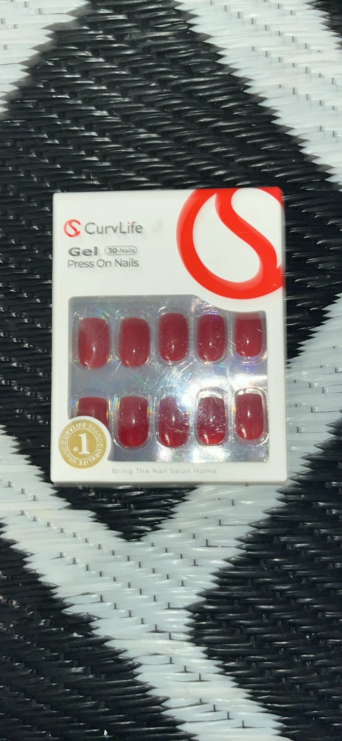 This is a package of CurvLife gel press-on nails. It includes 30 nails, offering a salon-at-home manicure experience. These are ready for application and come in a deep red shade.
