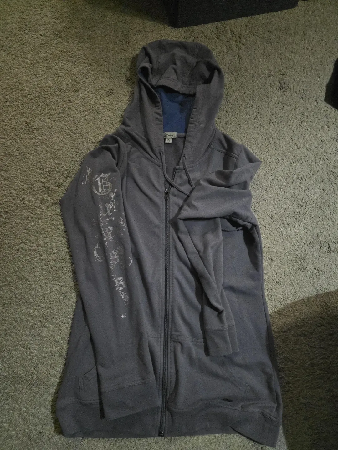 Grey Guess zip-up hoodie with a full zipper and hood. It features a graphic design on the left sleeve and two front pockets. The interior lining of the hood is blue.