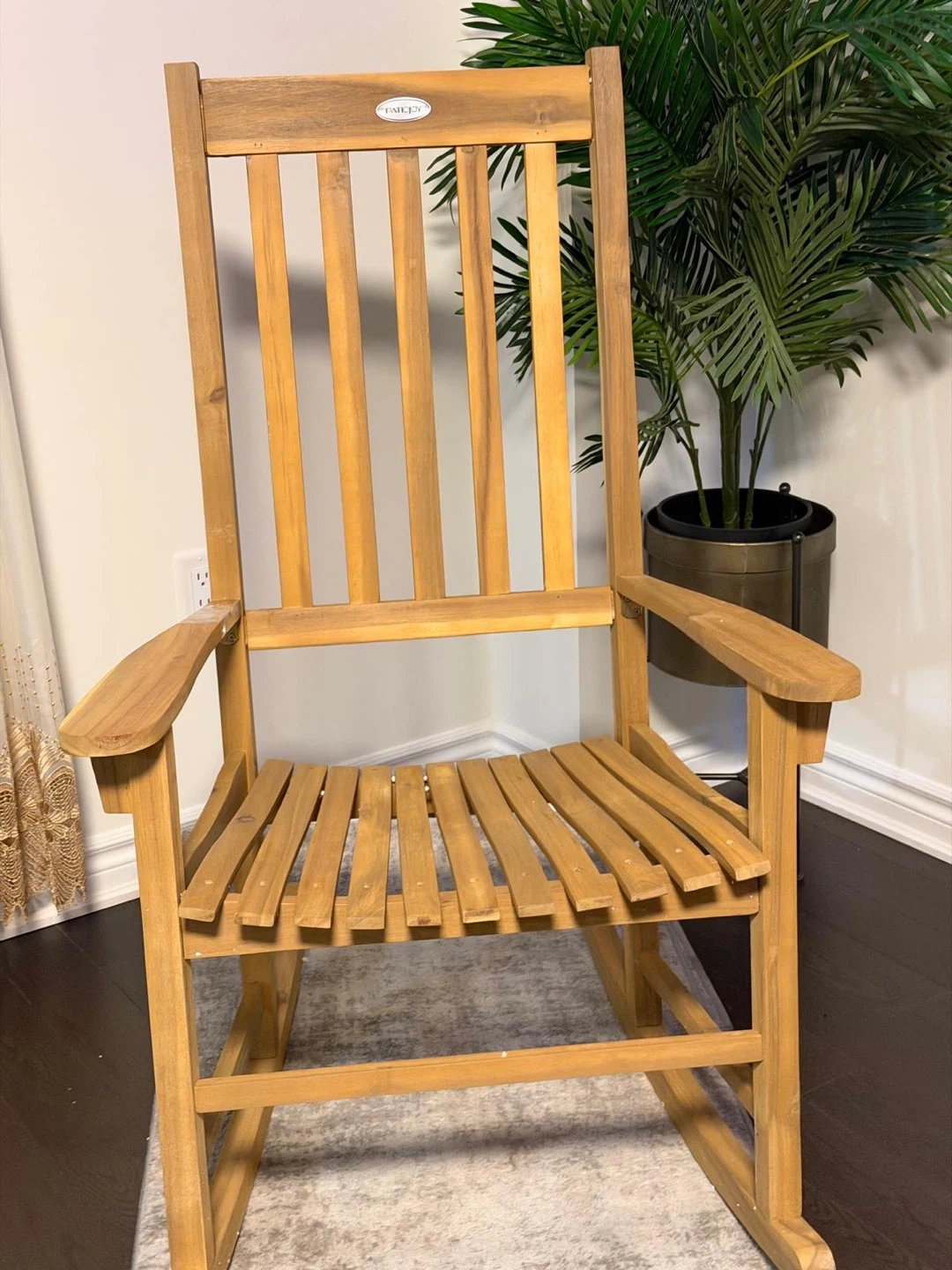 A sturdy wooden rocking chair with a natural finish. It's 45.5 inches tall and has a weight capacity of 350 lbs. Perfect for relaxing on your porch or indoors!