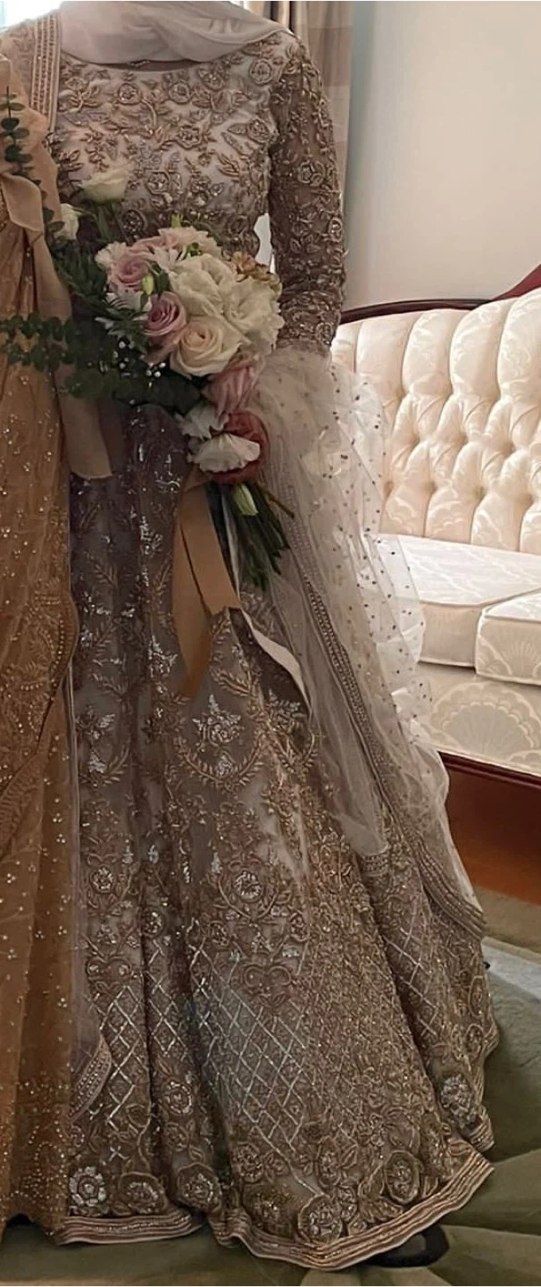 Dupatta: Includes a beautiful long net veil style dupatta with scattered delicate silver/gold details, giving it a soft, ethereal appearance.