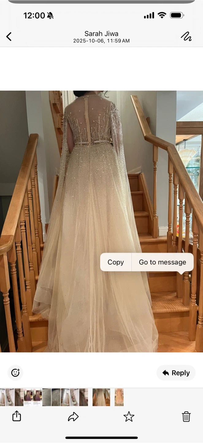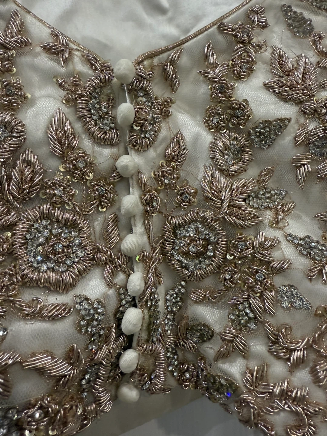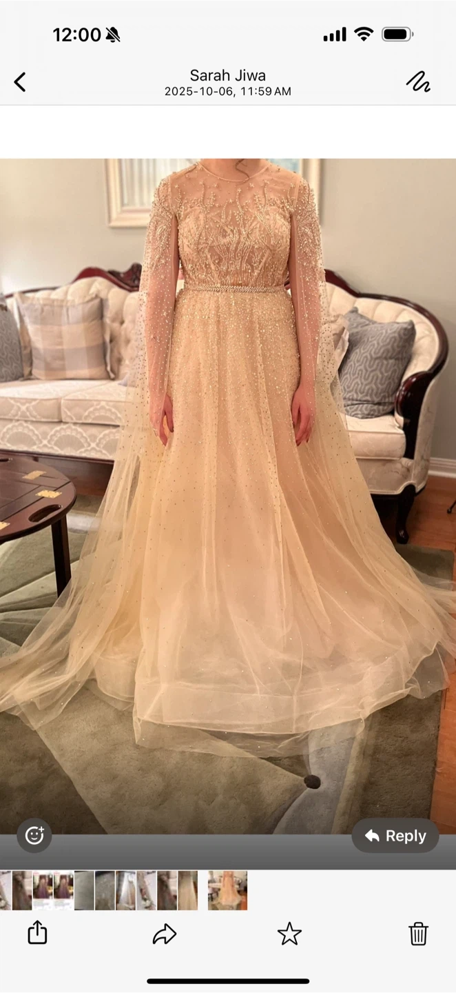 Color: Elegant soft gold/champagne base with heavy, intricate embroidery.