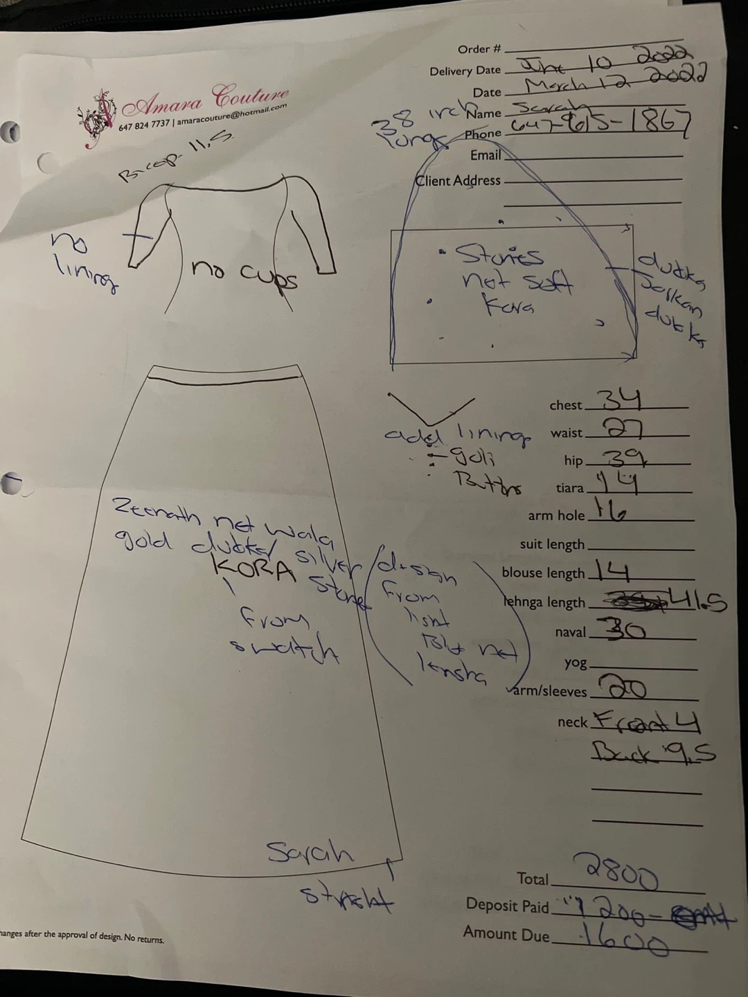 Blouse Details: Long sleeves, boat/scoop neckline (Front 4", Back 9.5"), and made without cups (as per the sketch).