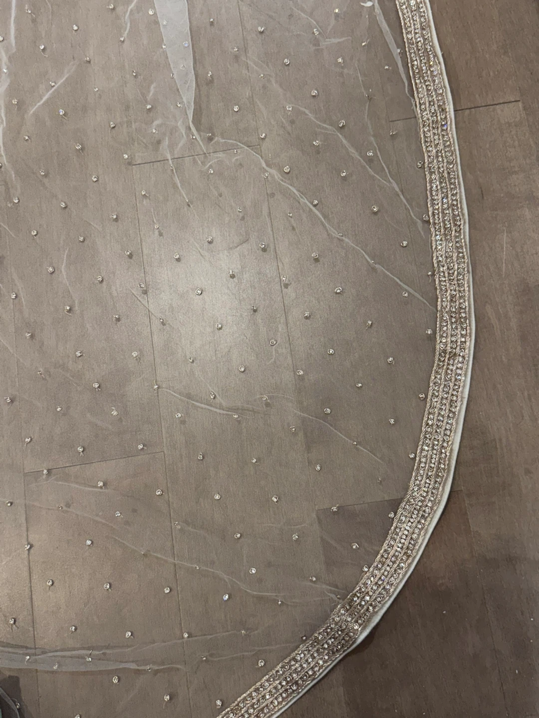 Style: Long-sleeved top (Blouse) and a full, flowing bottom (Lehenga/Skirt) and long veil with border and hand crystalnwork.