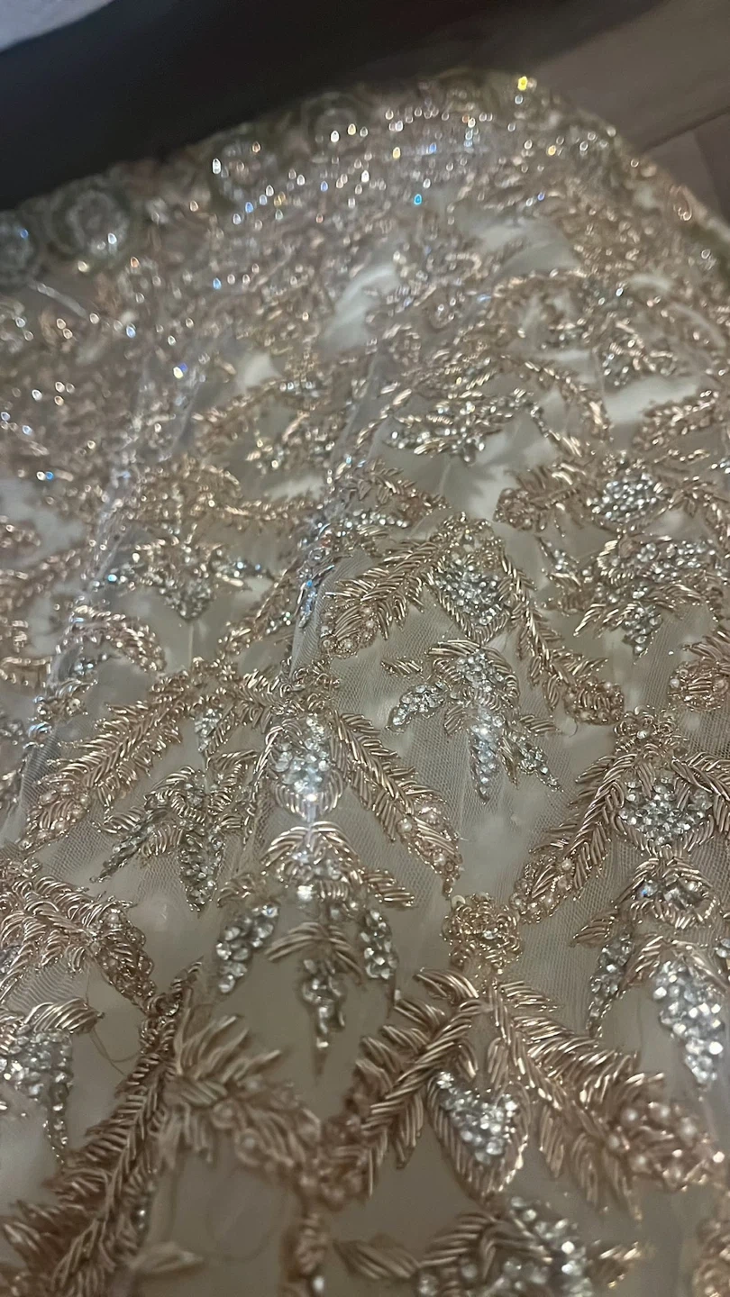 Color: Elegant soft gold/champagne base with heavy, intricate embroidery.