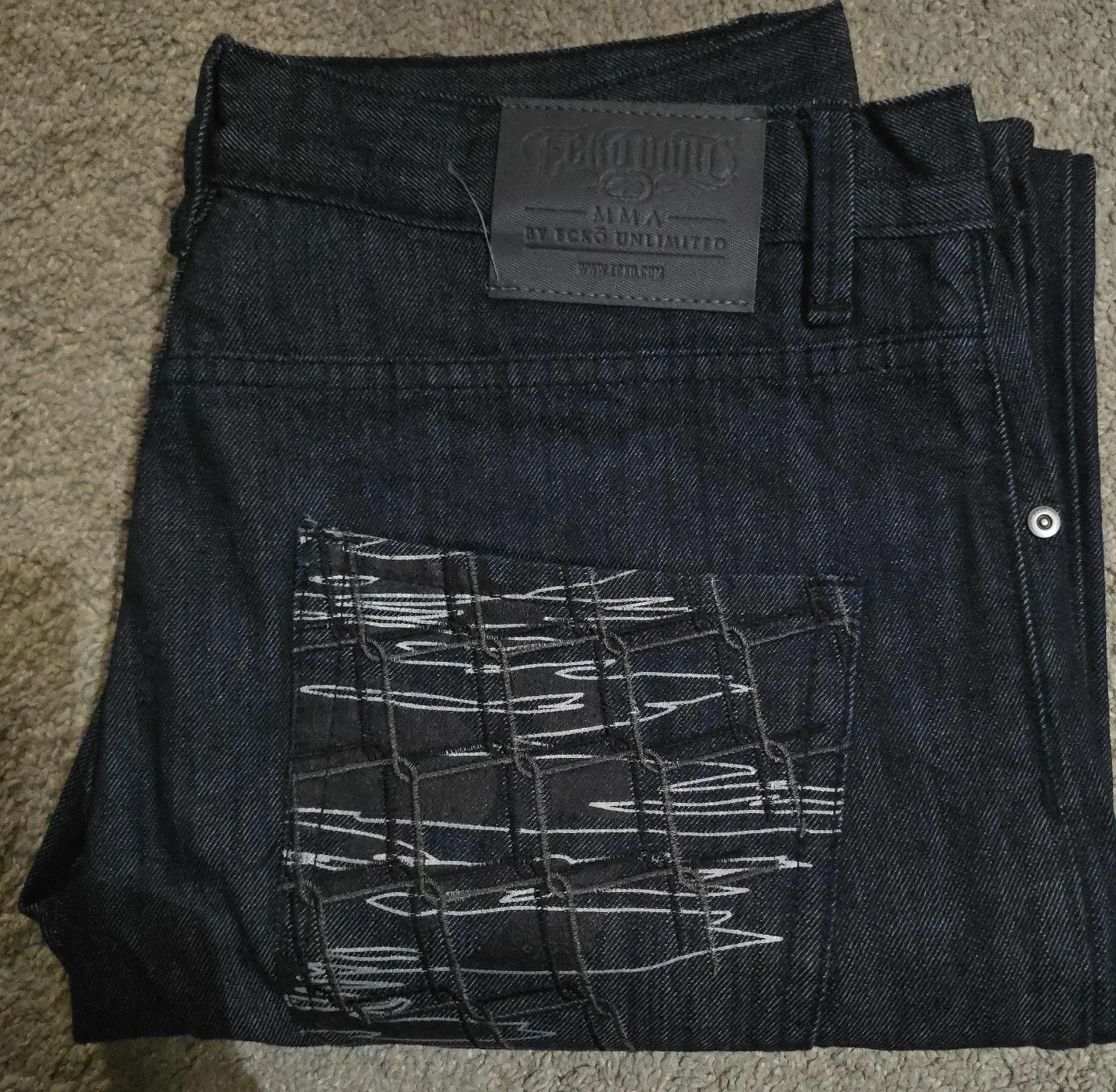 These ECKO UNLIMITED "Alma" jeans are a dark wash denim. They feature distinctive embroidered pocket detailing. Perfect for casual wear.