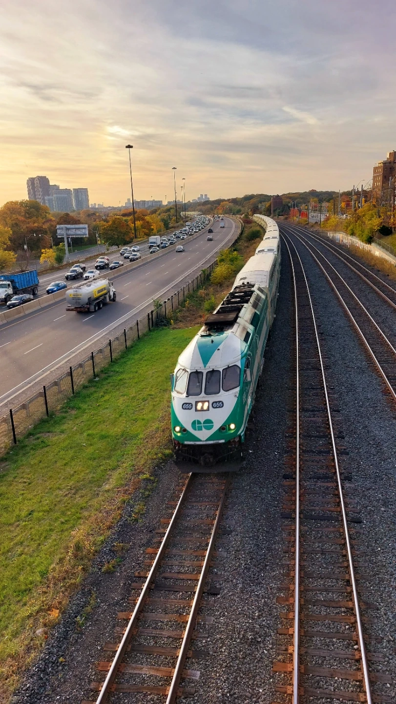 Photo print of a GO Transit train in its signature green and white livery on the tracks alongside a busy highway during rush hour travelling toward Toronto Union Station.