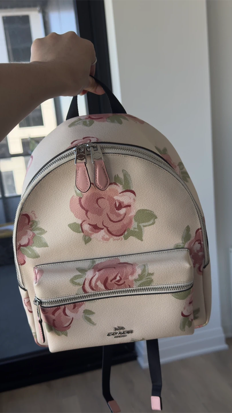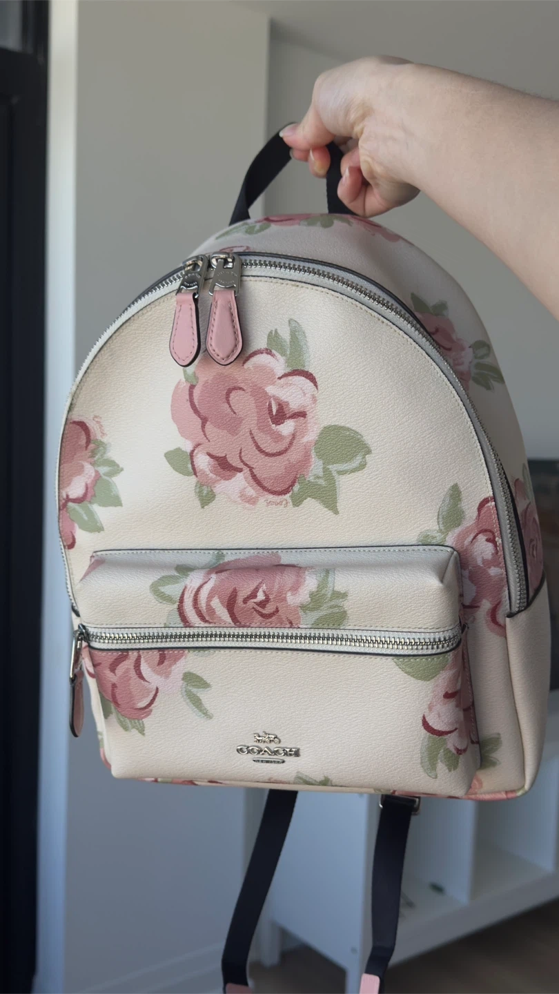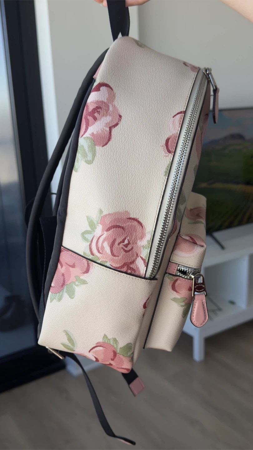 This Coach backpack features a lovely rose print. It's made of leather and has a zip-around closure with front pocket. It's a stylish way to carry your essentials!