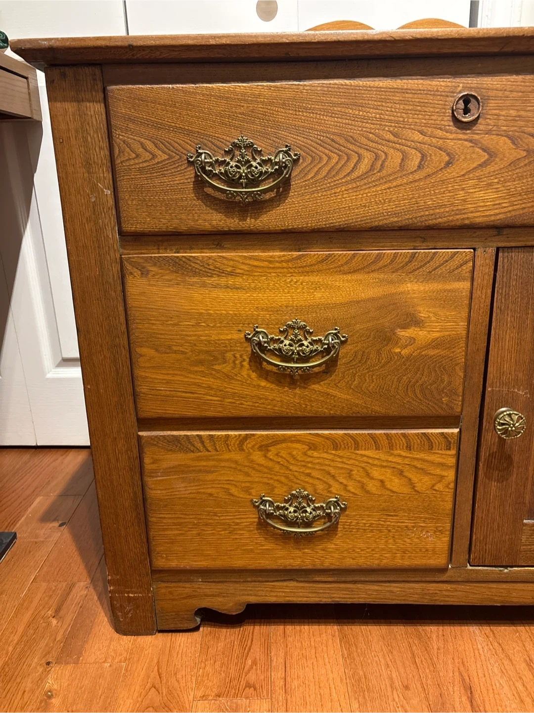 This antique dresser is made of solid oak with ornate brass hardware. It features 2 small drawers on the left, 1 long drawer on top and a cabinet with a door on the right. The wood has a warm, natural finish.