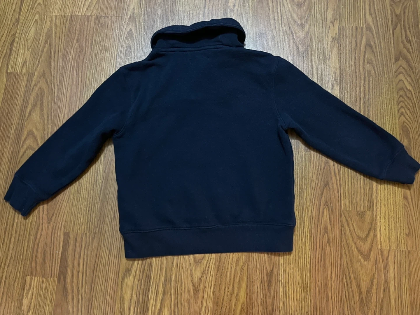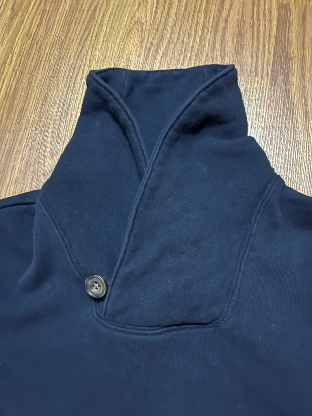 GapKids boys’ long sleeve pullover in navy blue. Sweatshirt-style fabric with a shawl collar neckline that has a button and loop closure. Minimal design with ribbed cuffs and waist for a classic, preppy look.