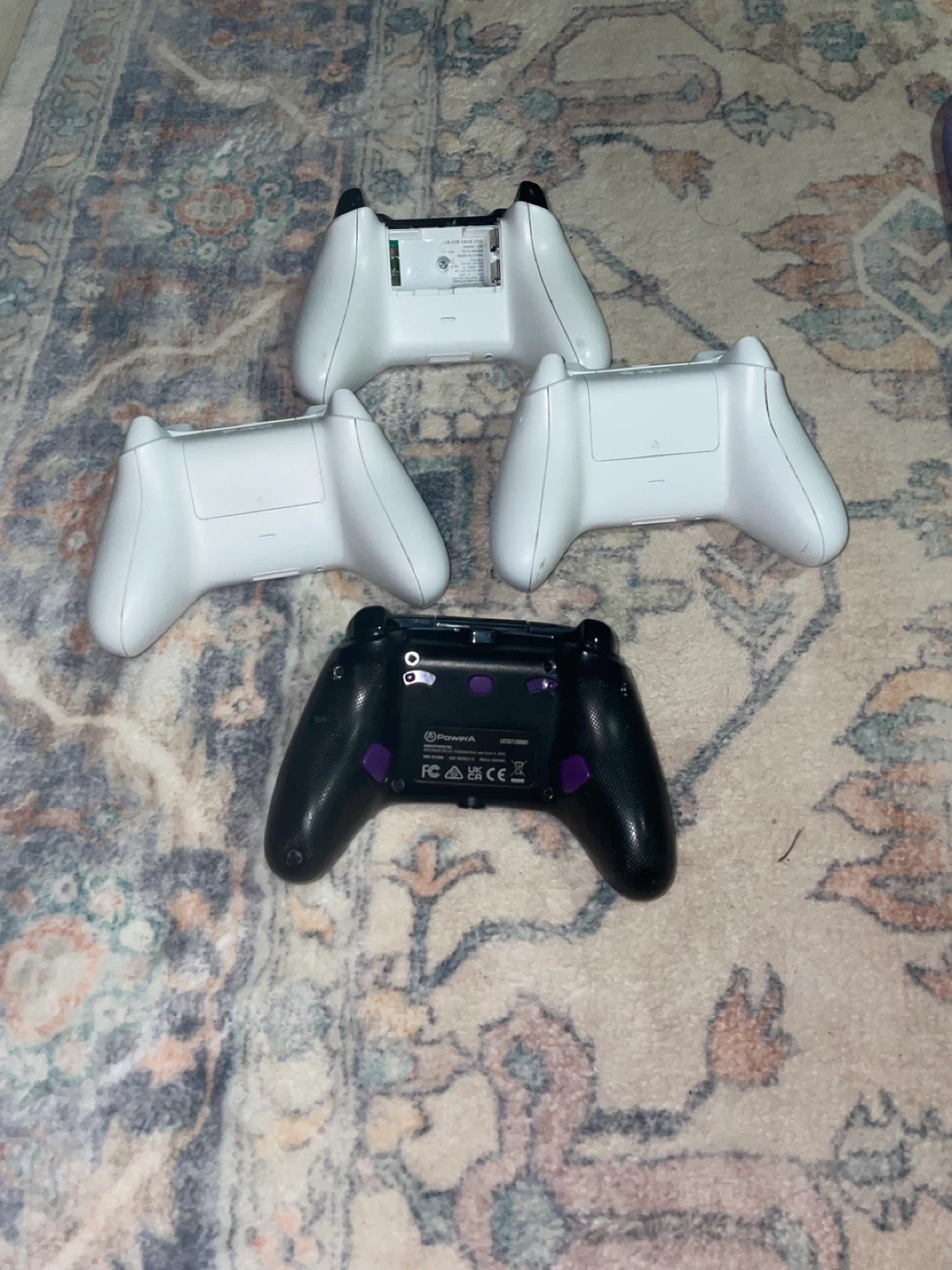 Three white Xbox wireless controllers and one PowerA purple and black enhanced wired controller. All controllers have been tested and are in good working order. These controllers are compatible with Xbox One, Xbox Series X/S, and PC. one of the white ones are missing the back