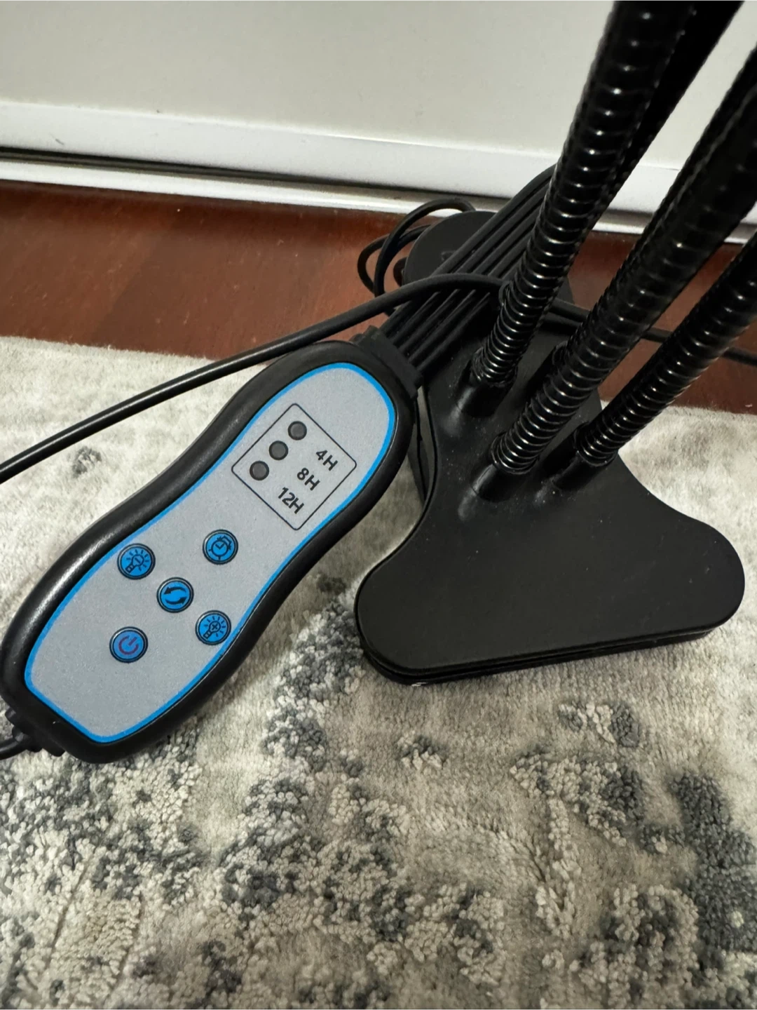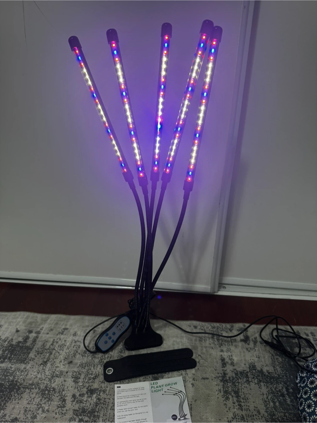 This LED plant grow light has five flexible goosenecks, each with adjustable brightness and spectrum. It includes a remote control with a timer function for 4, 8, or 12 hours. This light provides full spectrum illumination for seedlings and houseplants.