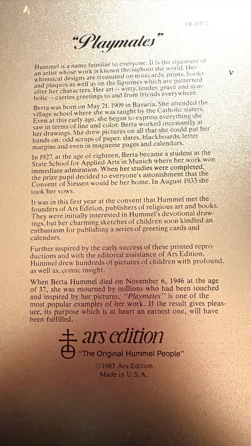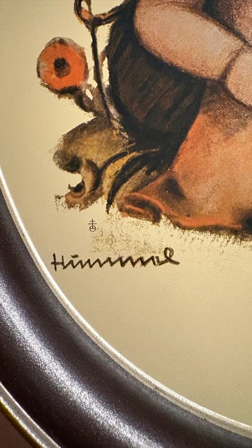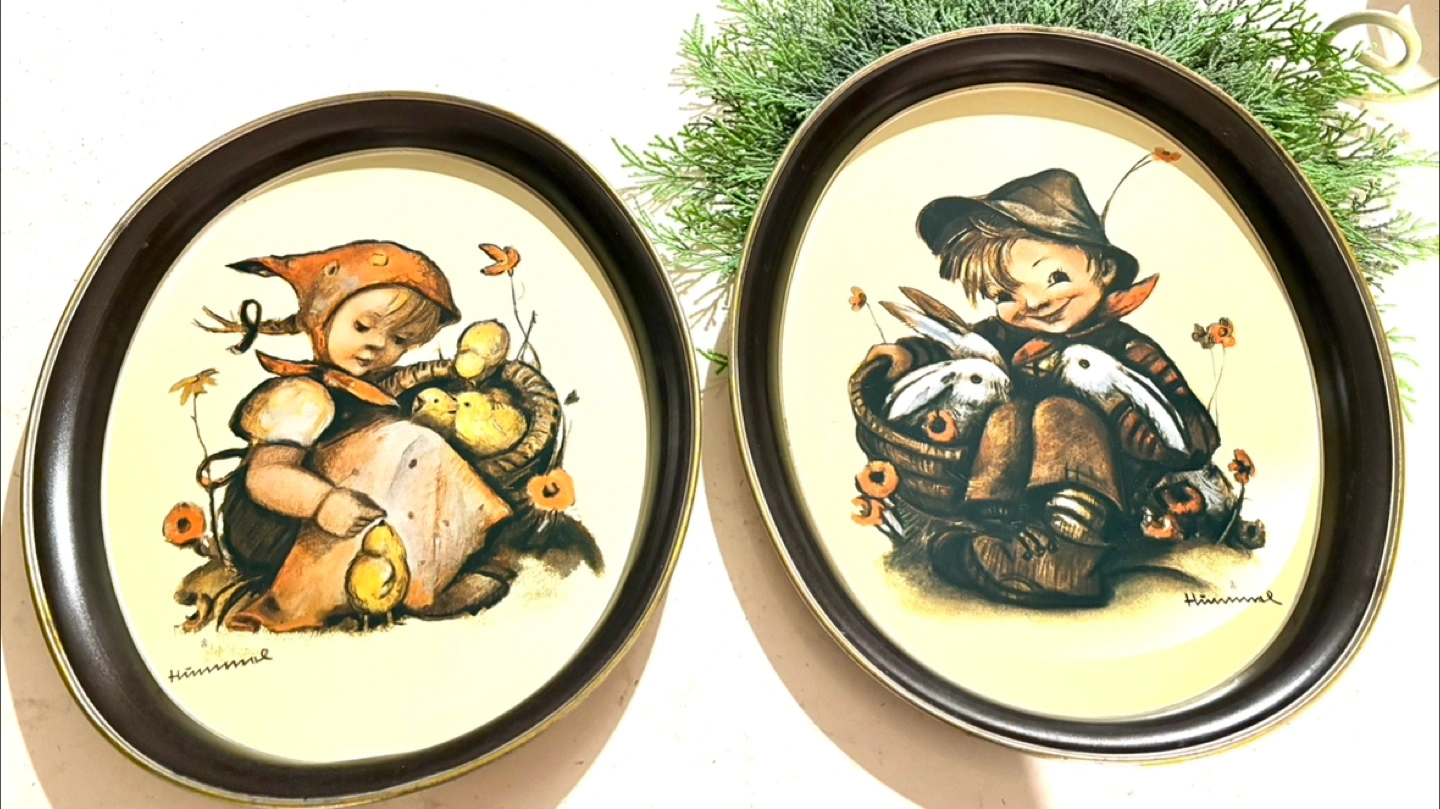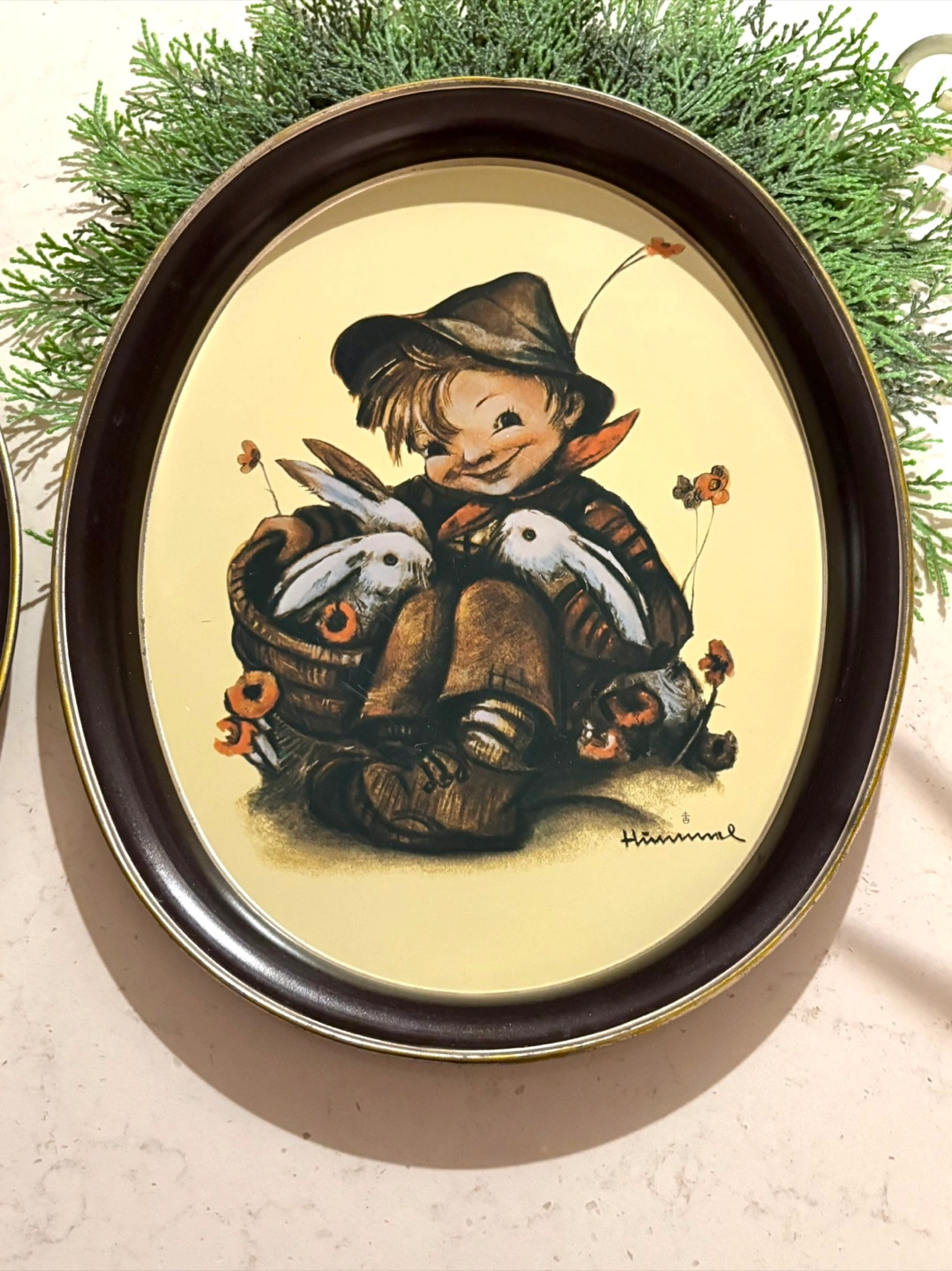 Adorable vintage set of two metal oval trays featuring classic Hummel artwork.