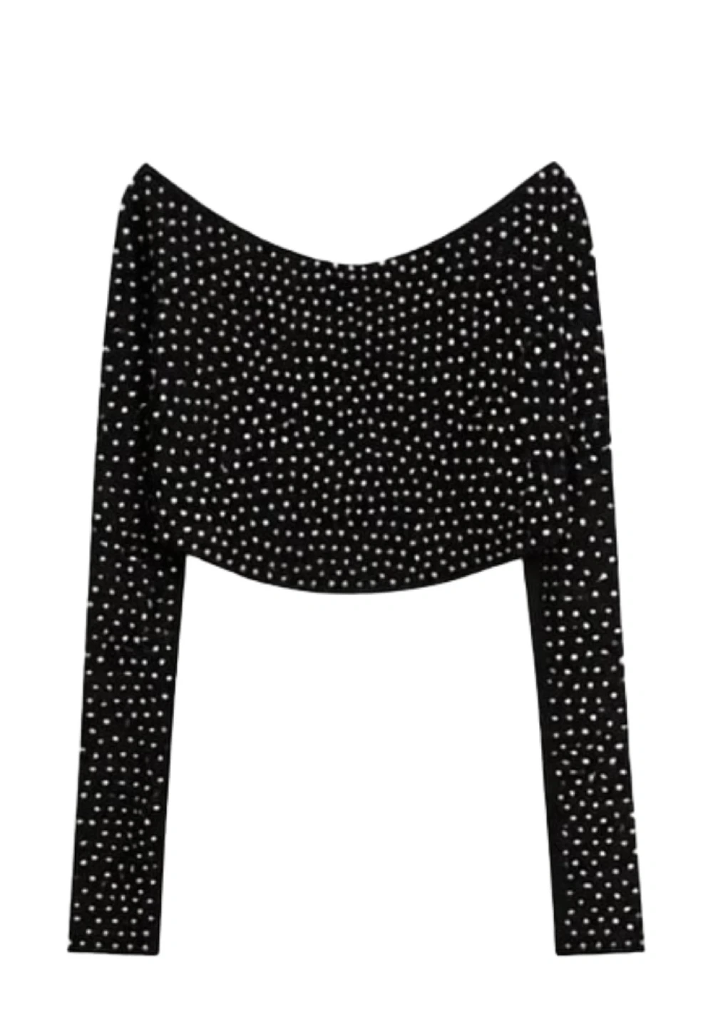 Stunning black long-sleeve crop top by Alta | Symphony fully adorned with sparkly rhinestones for a statement look. Features a flattering scooped neckline and a structured cropped fit. Perfect for nights out, festivals, concerts, or going-out outfits. Amazing quality and great condition.