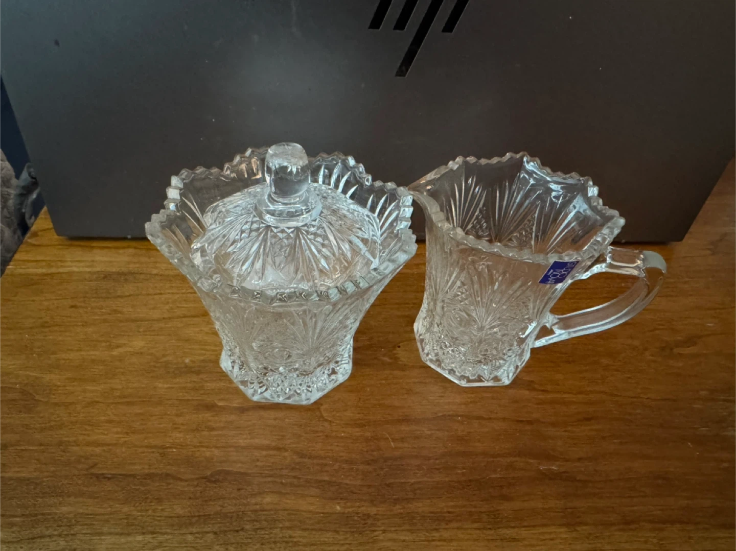 This is a Studio Nova crystal sugar and creamer set. It's made of clear glass with a decorative cut pattern. This set is perfect for serving sugar and cream at your table.