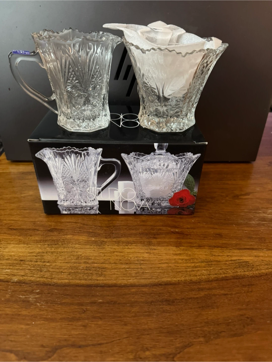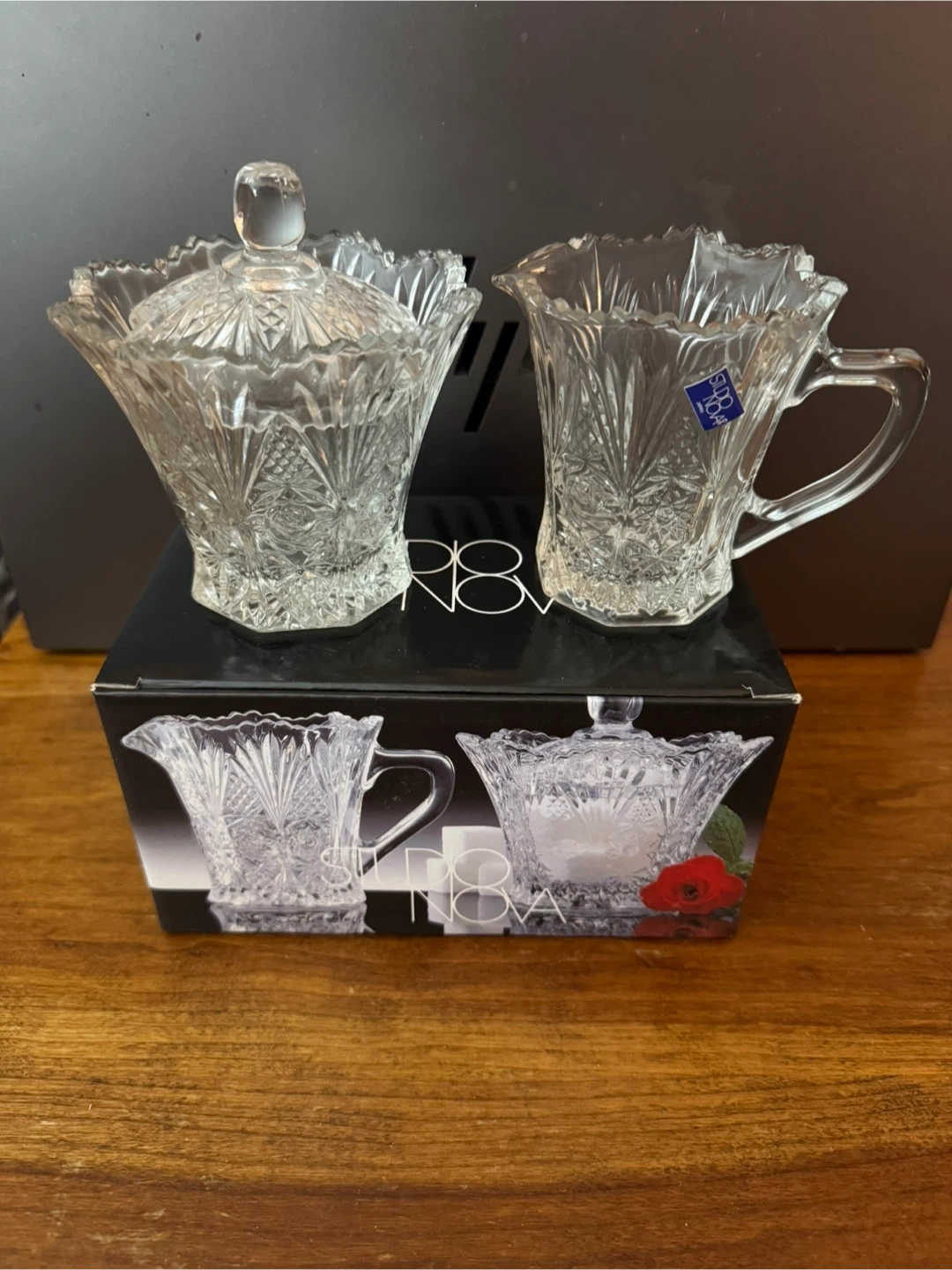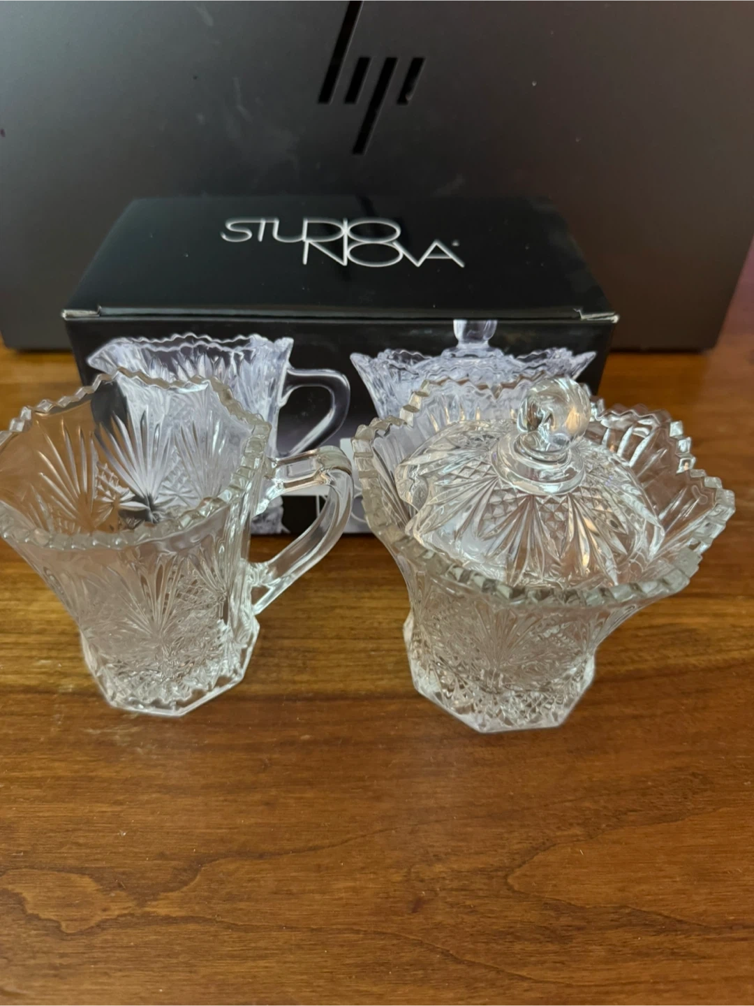 This is a Studio Nova crystal sugar and creamer set. It's made of clear glass with a decorative cut pattern. This set is perfect for serving sugar and cream at your table.