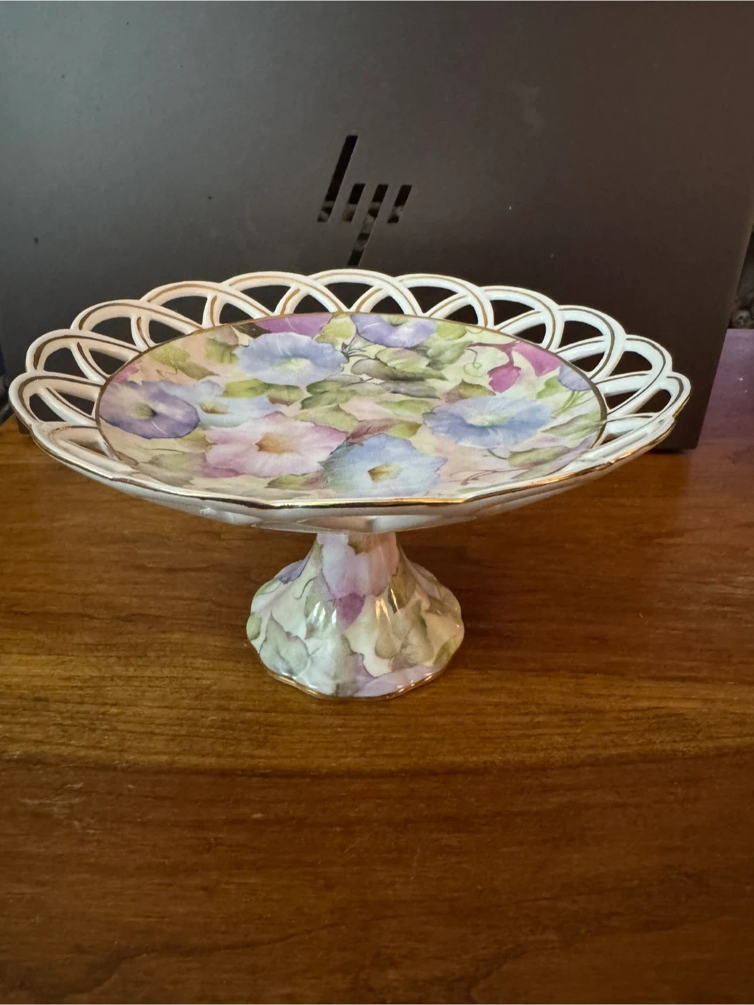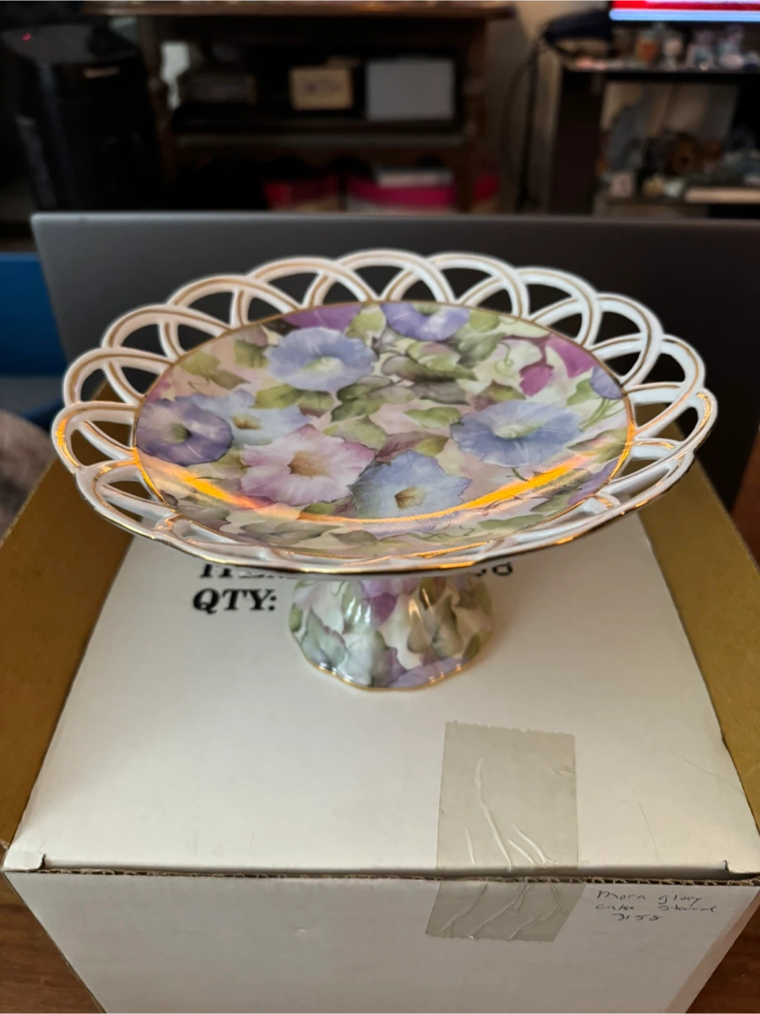 This elegant cake stand features a beautiful floral design with morning glories. It has a white latticed edge and gold trim. It's perfect for displaying cakes, pastries, or other treats at special occasions. The stand is made of ceramic.