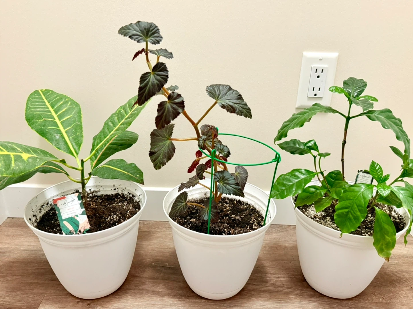 Three healthy plants in white pots including a Croton, a Coffee Arabica plant. These plants add a touch of nature to any indoor space.