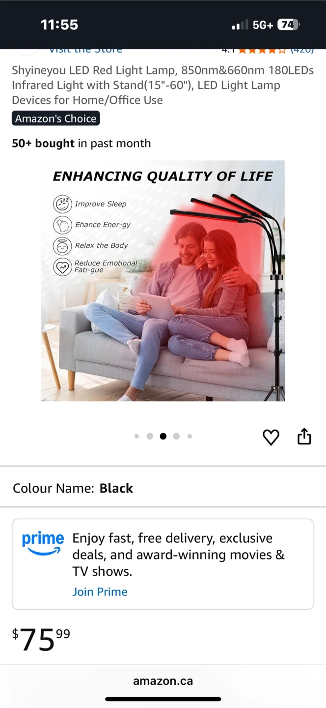 This ShineyYOU LED red light therapy lamp comes with a stand, adjustable from 15" to 60". It uses 850nm & 660nm infrared light for home or office use. The lamp is black and includes the original box and all components.
