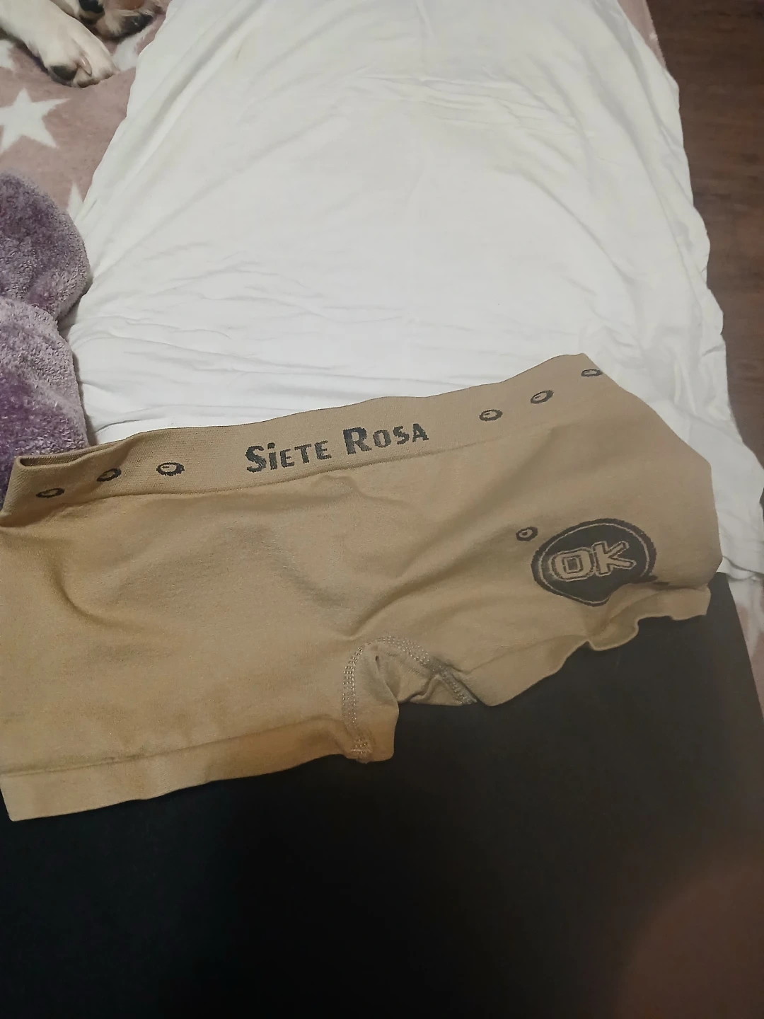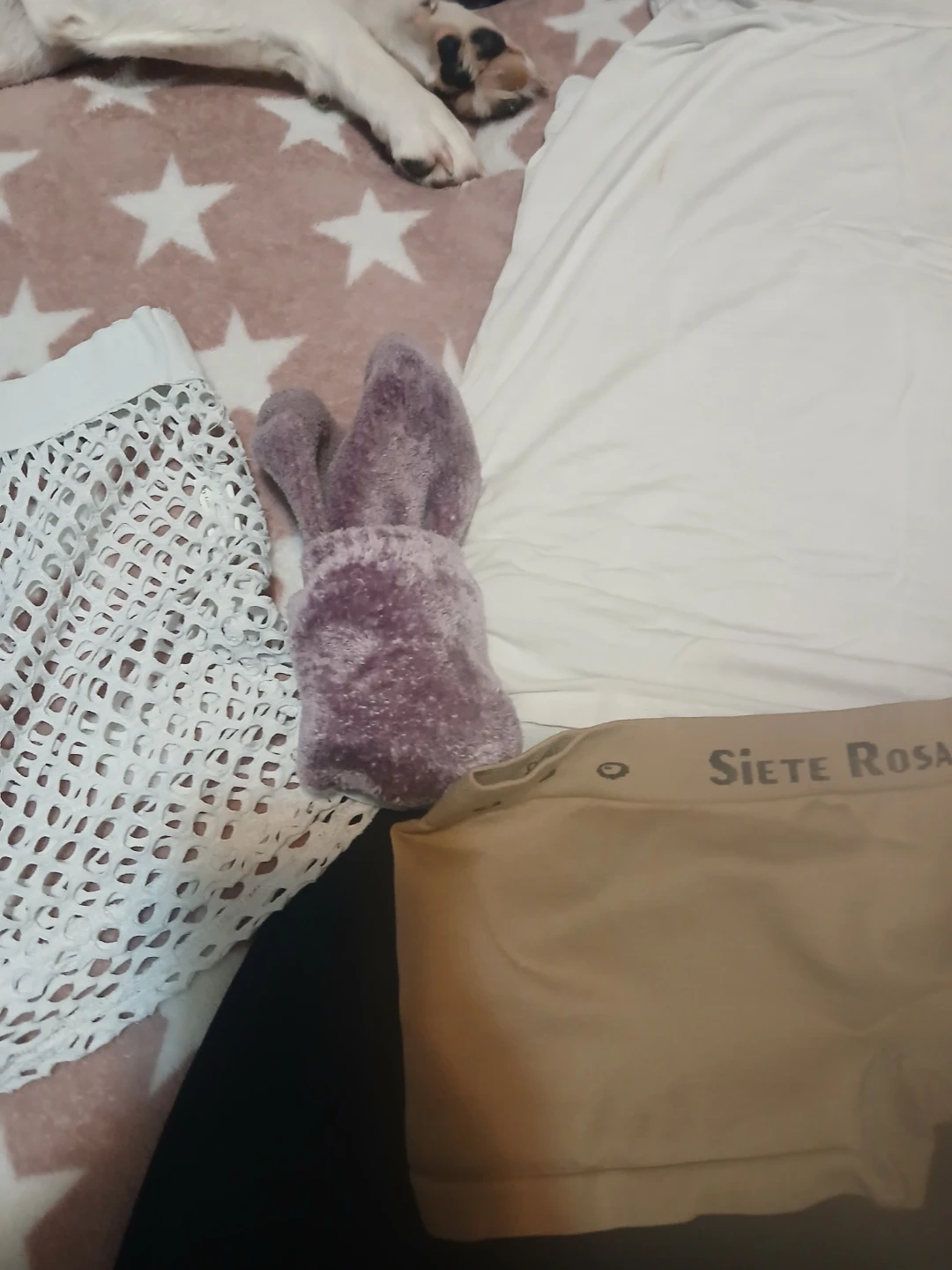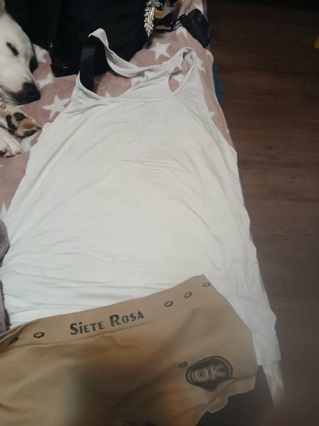 A Siete Rosa tank top and mesh shorts set. The tank top is white, and the shorts are white mesh. Includes matching tan Siete Rosa boy shorts. It's a comfy and stylish ensemble!🥕