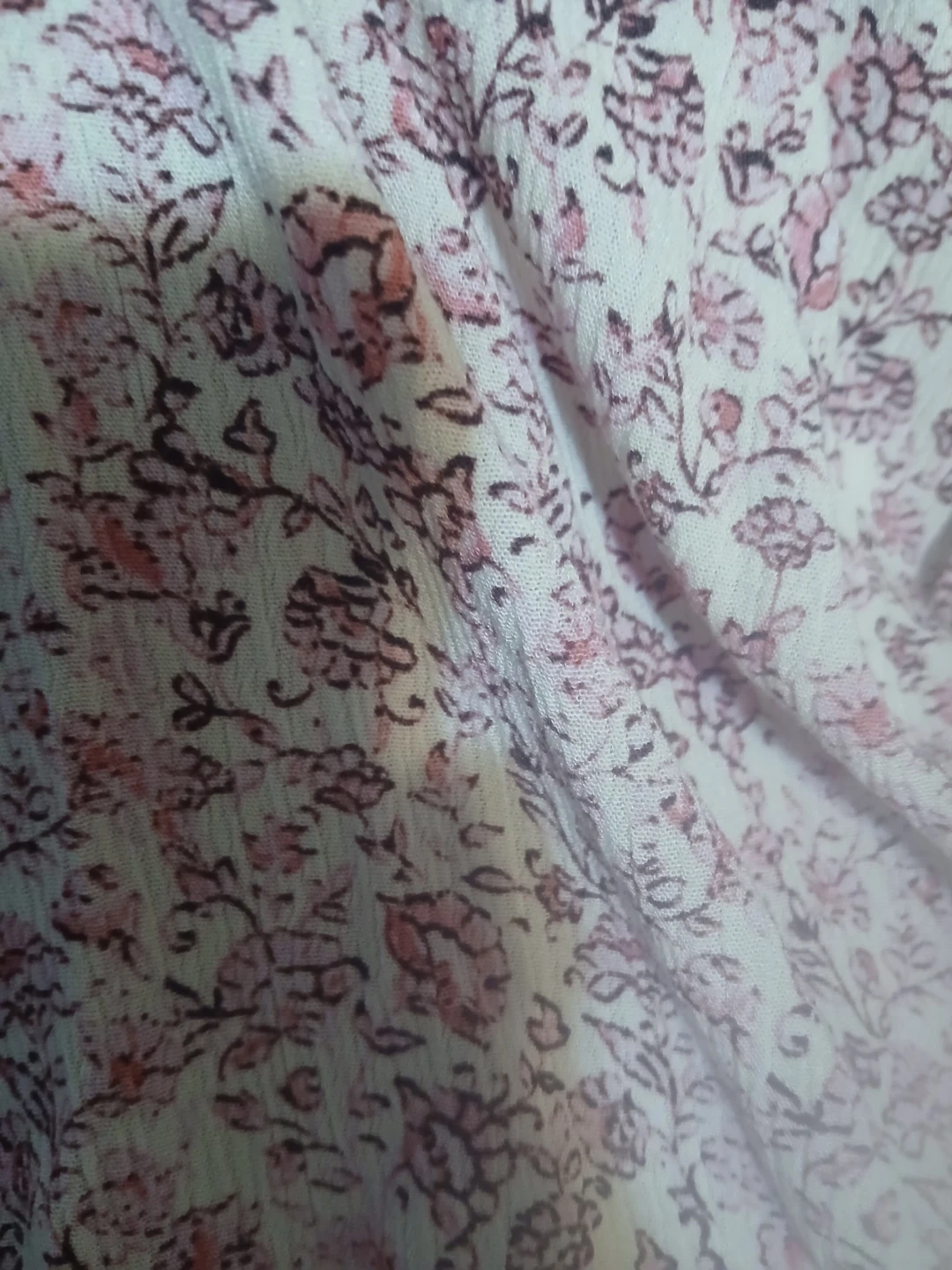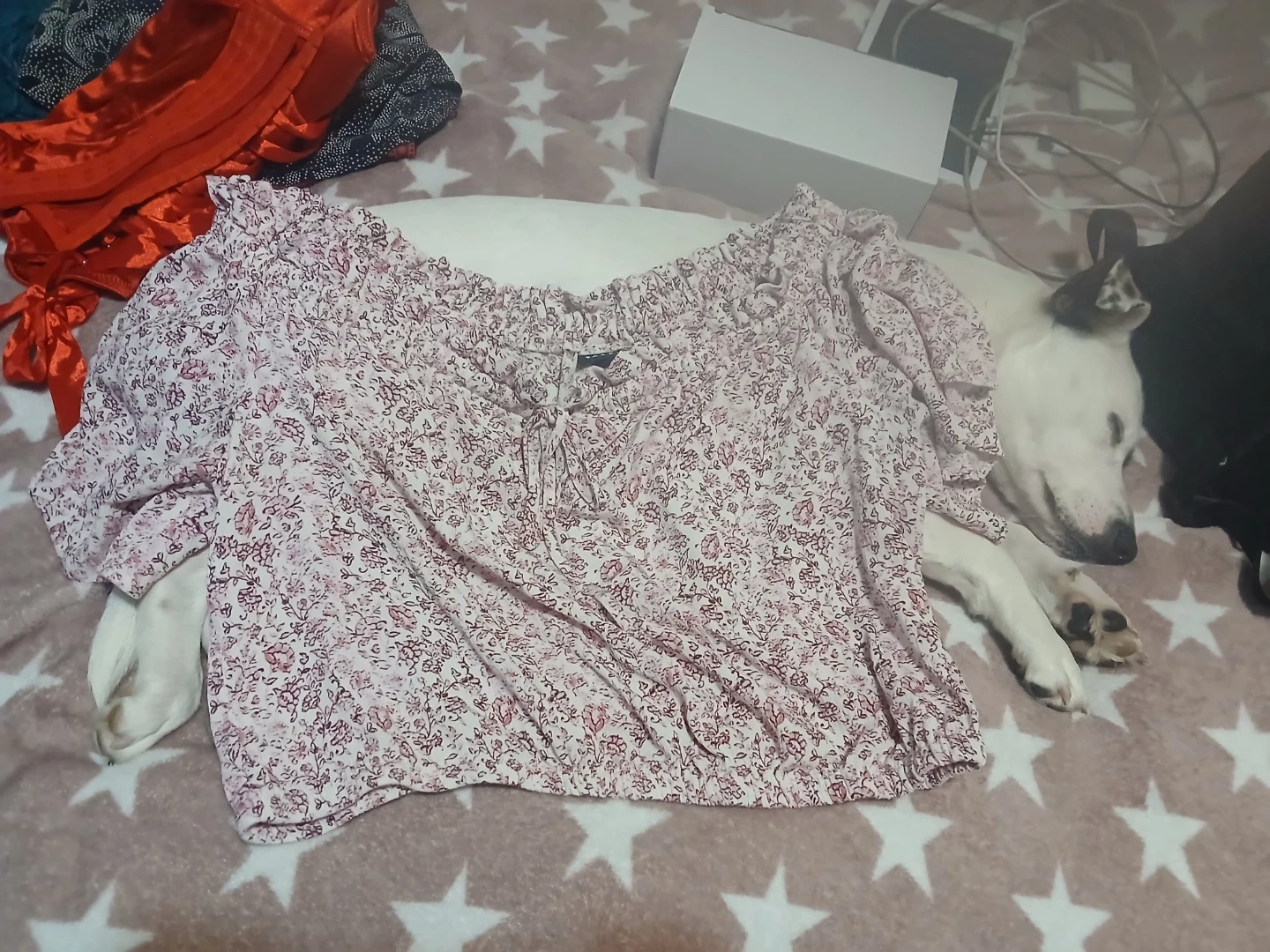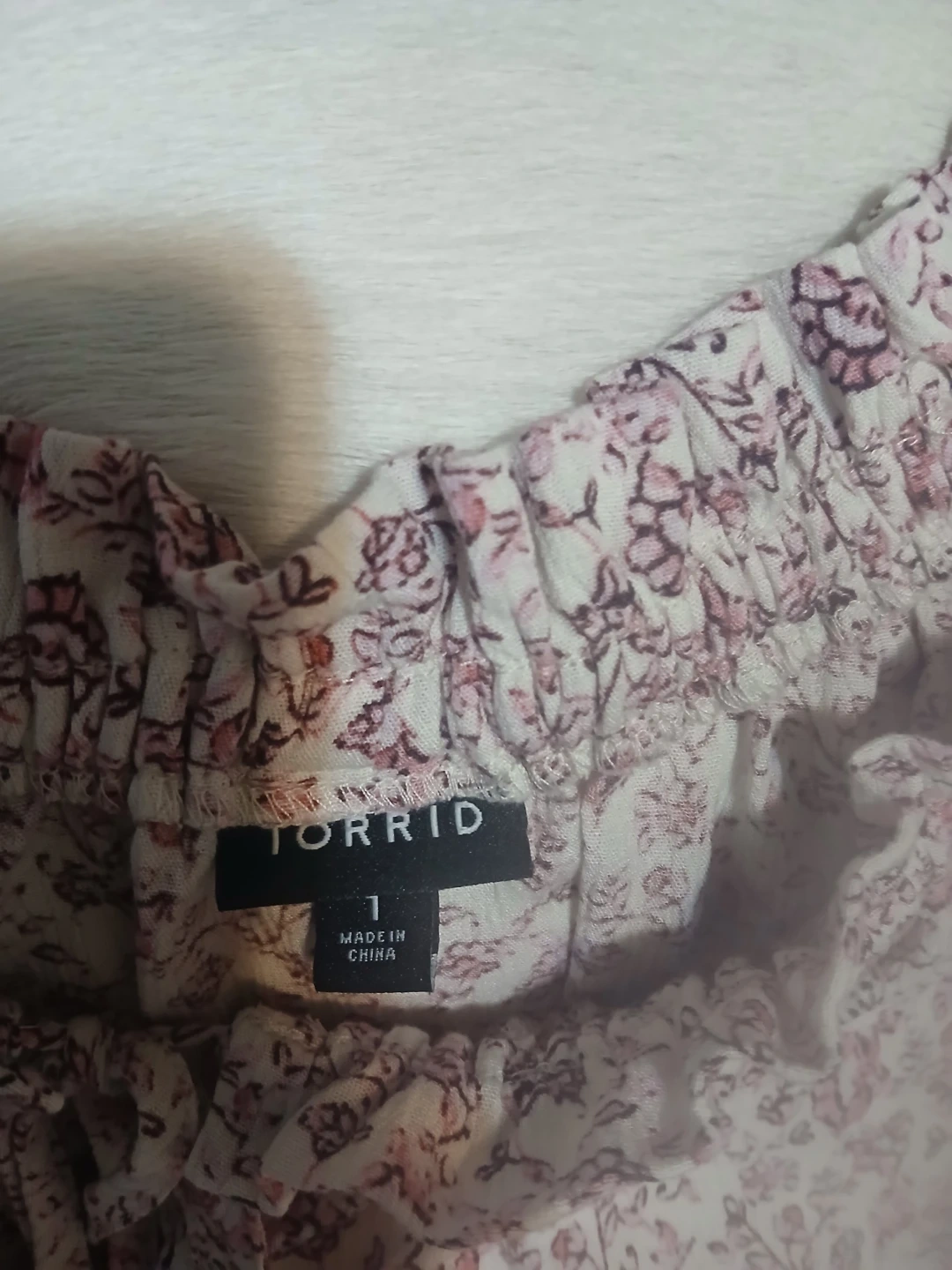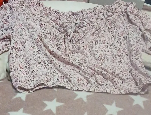 This Torrid top has an all-over pink and maroon floral print. It features an off-the-shoulder neckline with a tie detail and an elasticized hem. Made in China.🥕