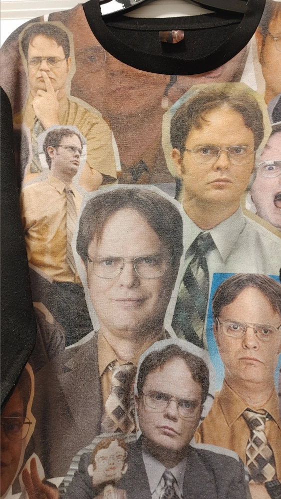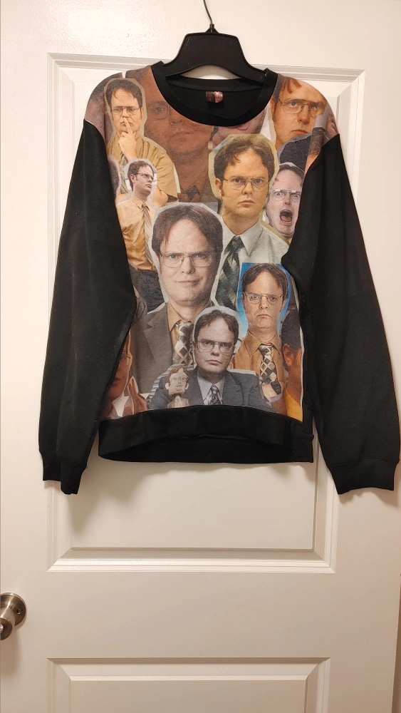 Long-sleeved black crewneck sweatshirt featuring a collage of Dwight Schrute images from The Office. Soft and comfortable material.