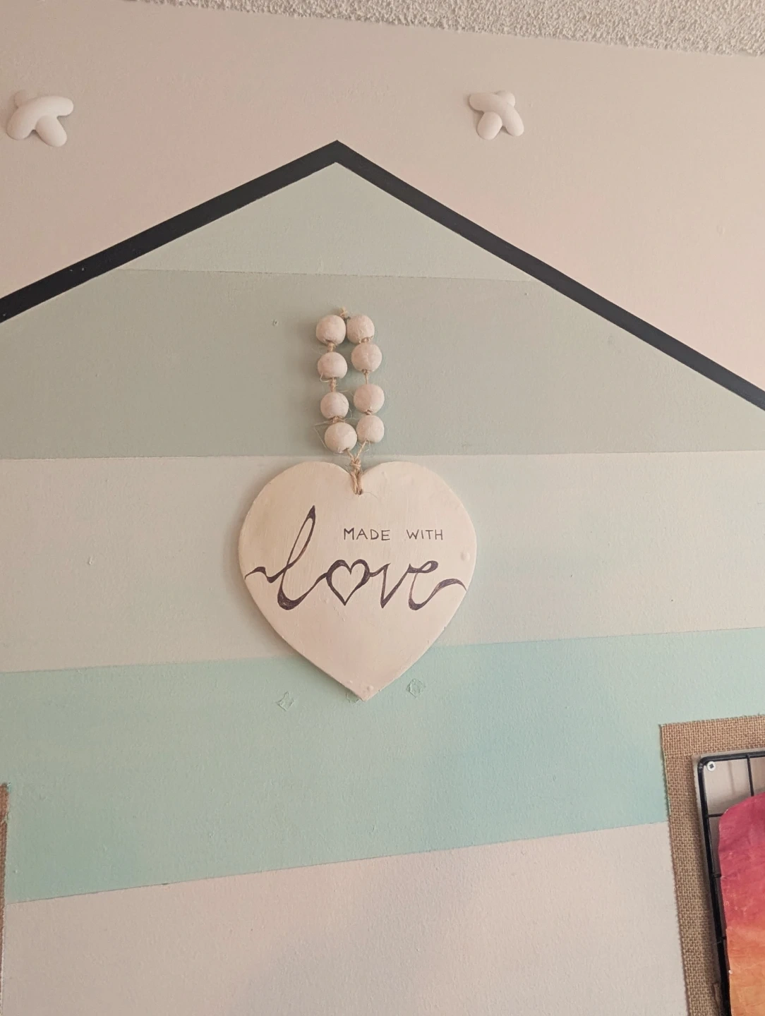 This is a charming white heart-shaped wall decor piece. It's inscribed with the phrase "Made With Love" in a lovely script. It features a beaded strand for hanging, adding a rustic touch. This piece would be a sweet addition to a child's bedroom or nursery!