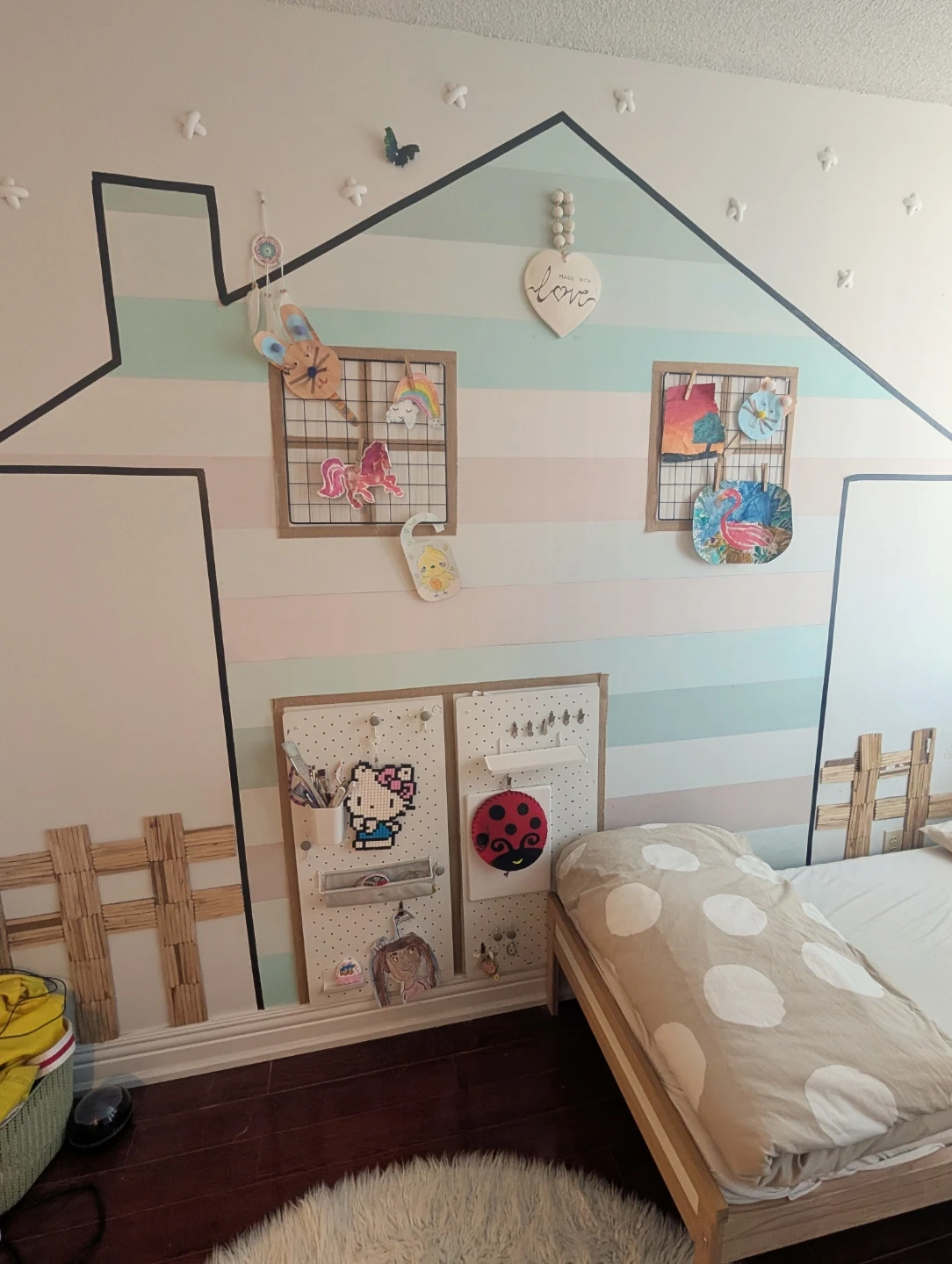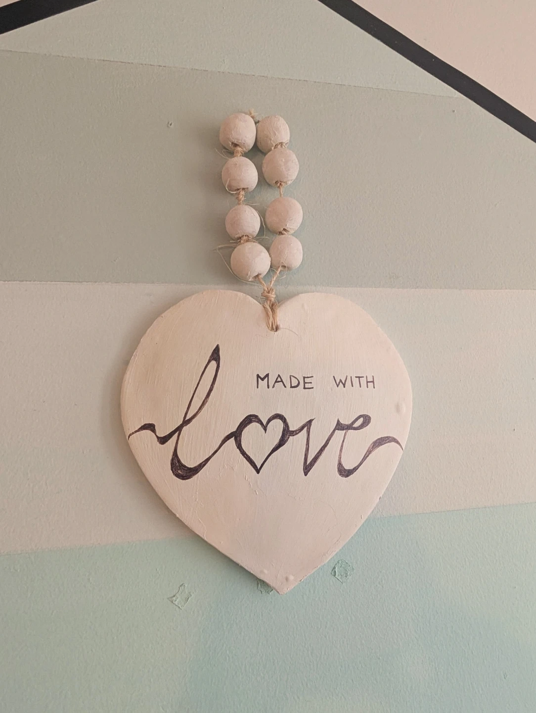 This is a charming white heart-shaped wall decor piece. It's inscribed with the phrase "Made With Love" in a lovely script. It features a beaded strand for hanging, adding a rustic touch. This piece would be a sweet addition to a child's bedroom or nursery!