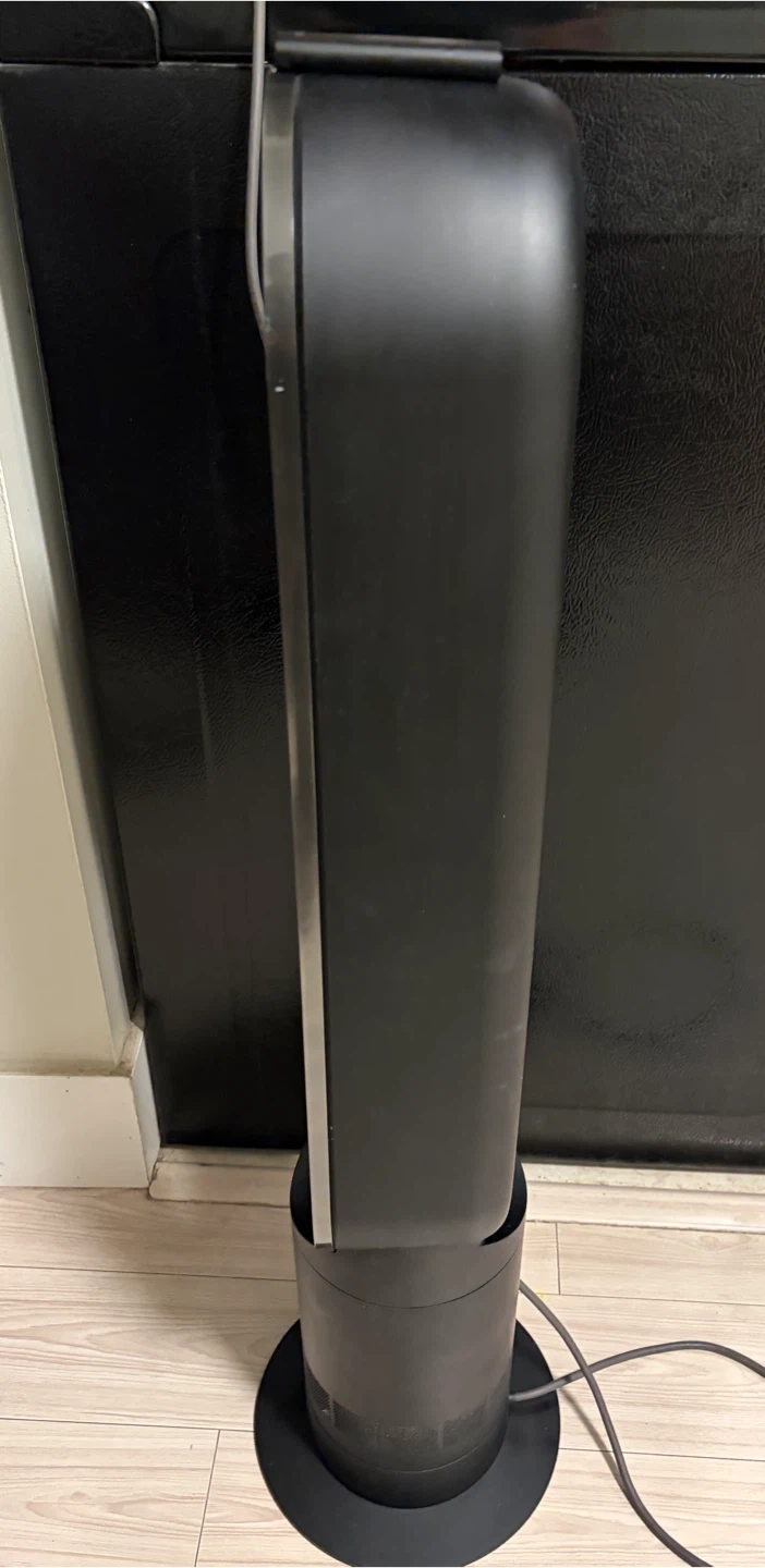 This is a Dyson Cool tower fan. It's a black and silver bladeless fan with a circular base. Its tall, slim design makes it a great addition to any room.