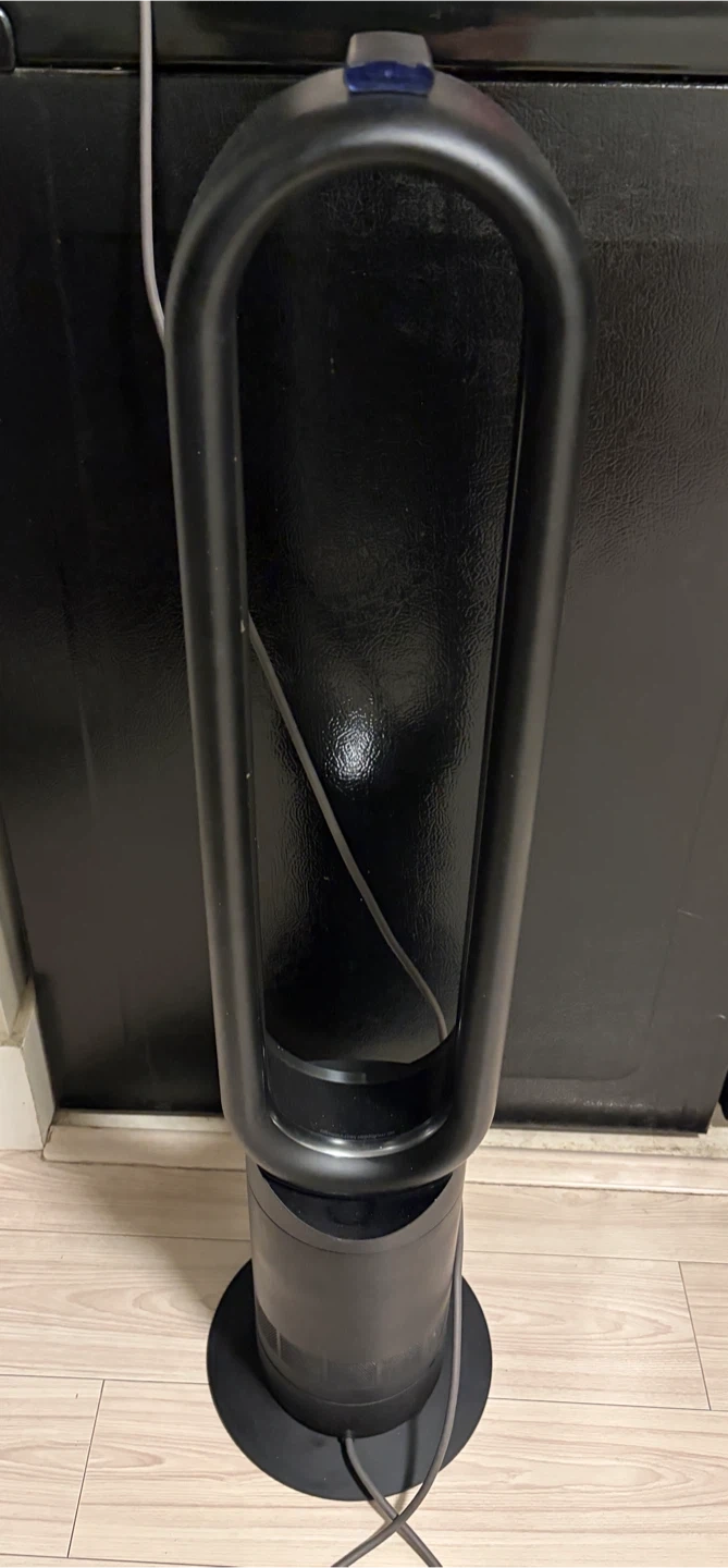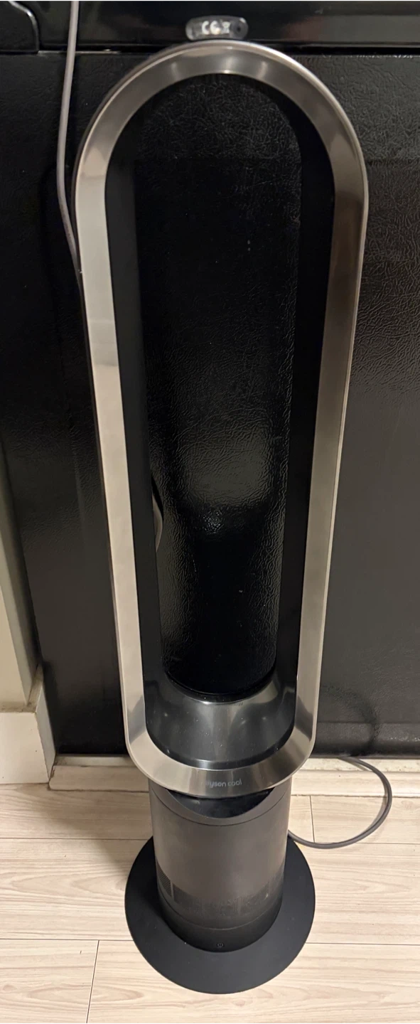 This is a Dyson Cool tower fan. It's a black and silver bladeless fan with a circular base. Its tall, slim design makes it a great addition to any room.