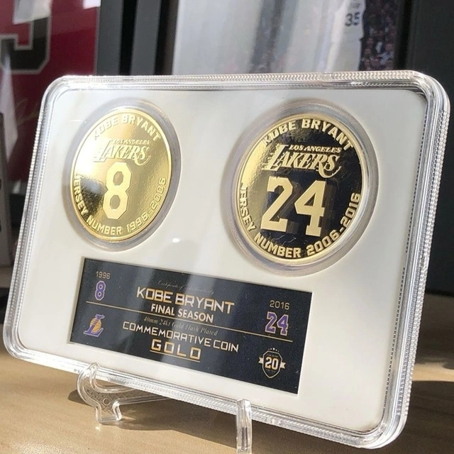 Gold plated Kobe Bryant Final Season commemorative coins. The set includes two coins with jersey numbers 8 and 24. Coins are 40mm and 24kt gold plated. Comes in a protective case with a label that has details about the coins. Condition: New. For Sale By: Owner.
