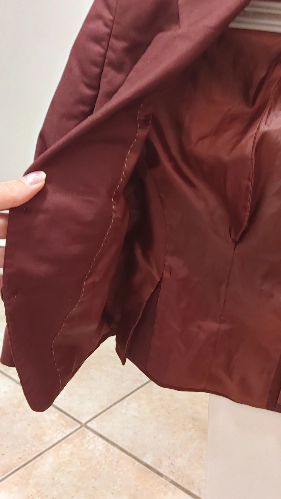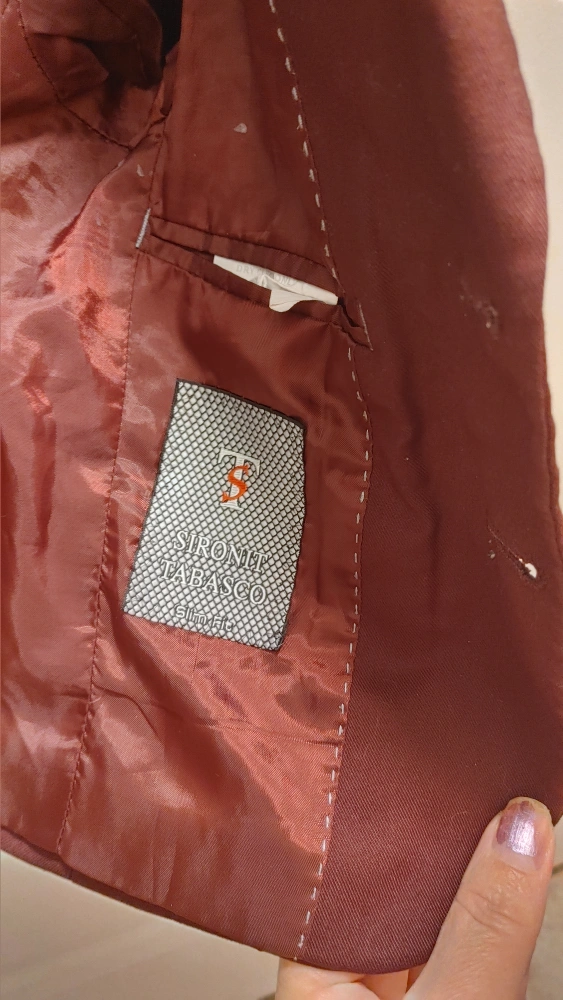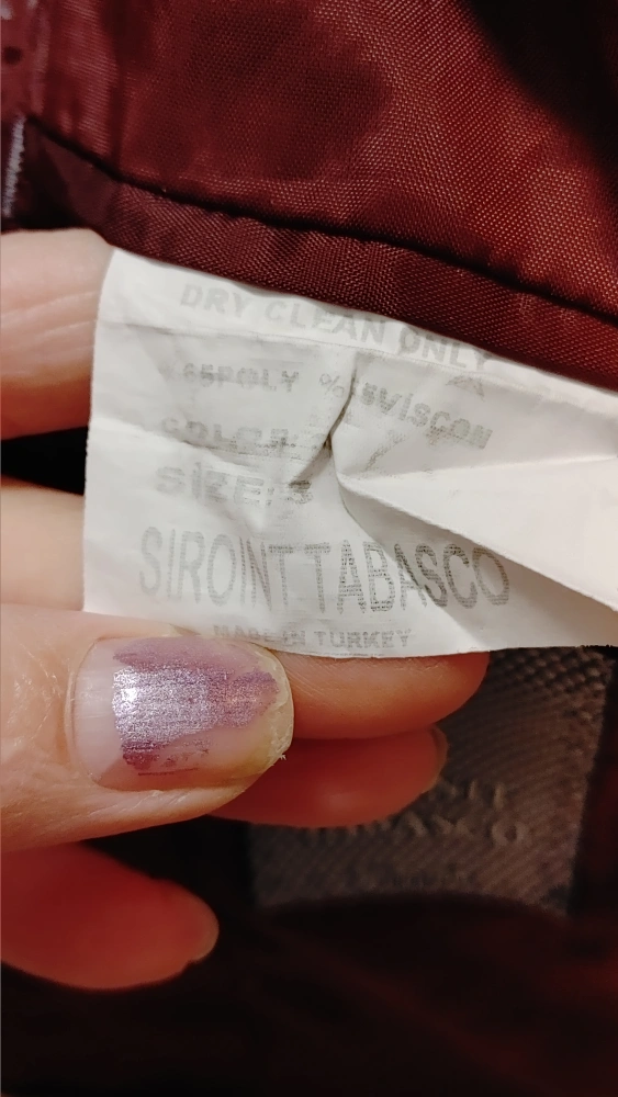 Slim fit blazer from Siront Tabasco. Made in Turkey. It's a size 3. Material is 65% polyester and 35% viscose. Dry clean only.