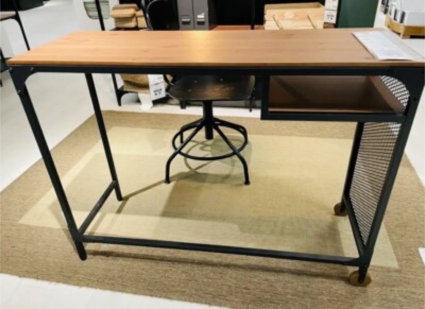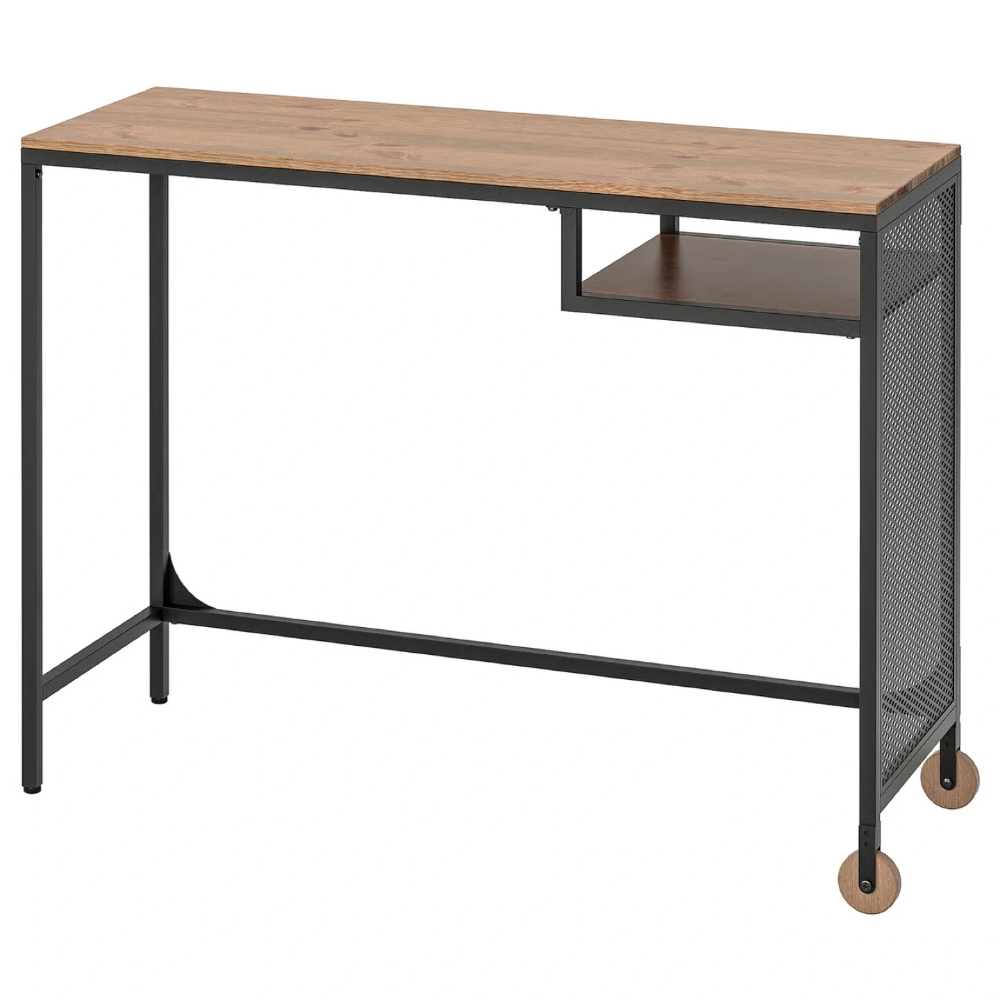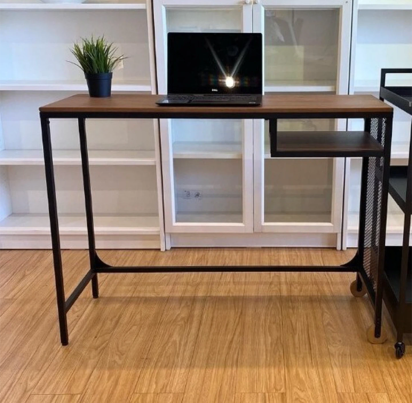 A modern industrial style desk with a wood look top and sturdy black metal frame. Features a built-in lower shelf for storage and caster wheels on one side for easy movement. Compact footprint but solid and stable! great for a home office, bedroom, or small workspace.