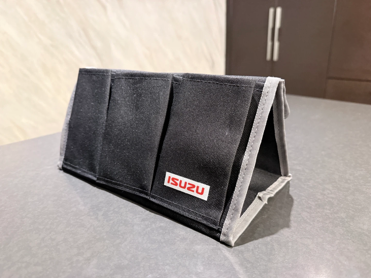 This Isuzu organizer is made of black fabric with grey trim and features multiple pockets. It's designed to help keep your tidy. Folds flat for easy storage when not in use.