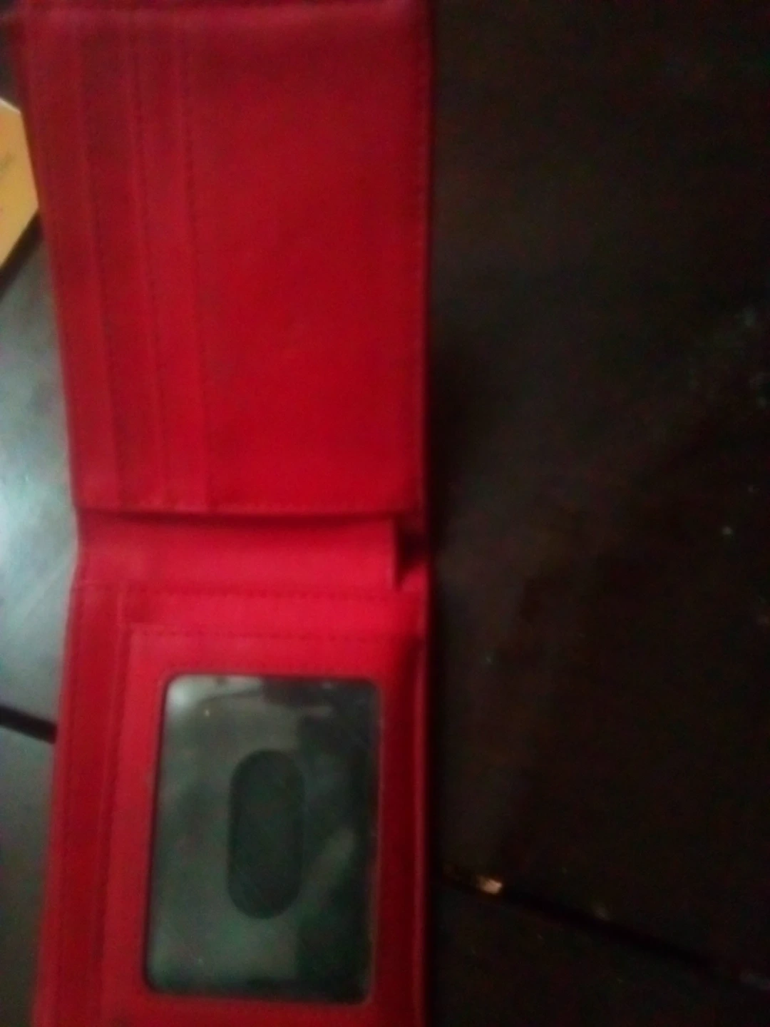 Bifold wallet with a carbon fiber exterior and red interior. Features multiple card slots and an ID window. Compact and durable design.